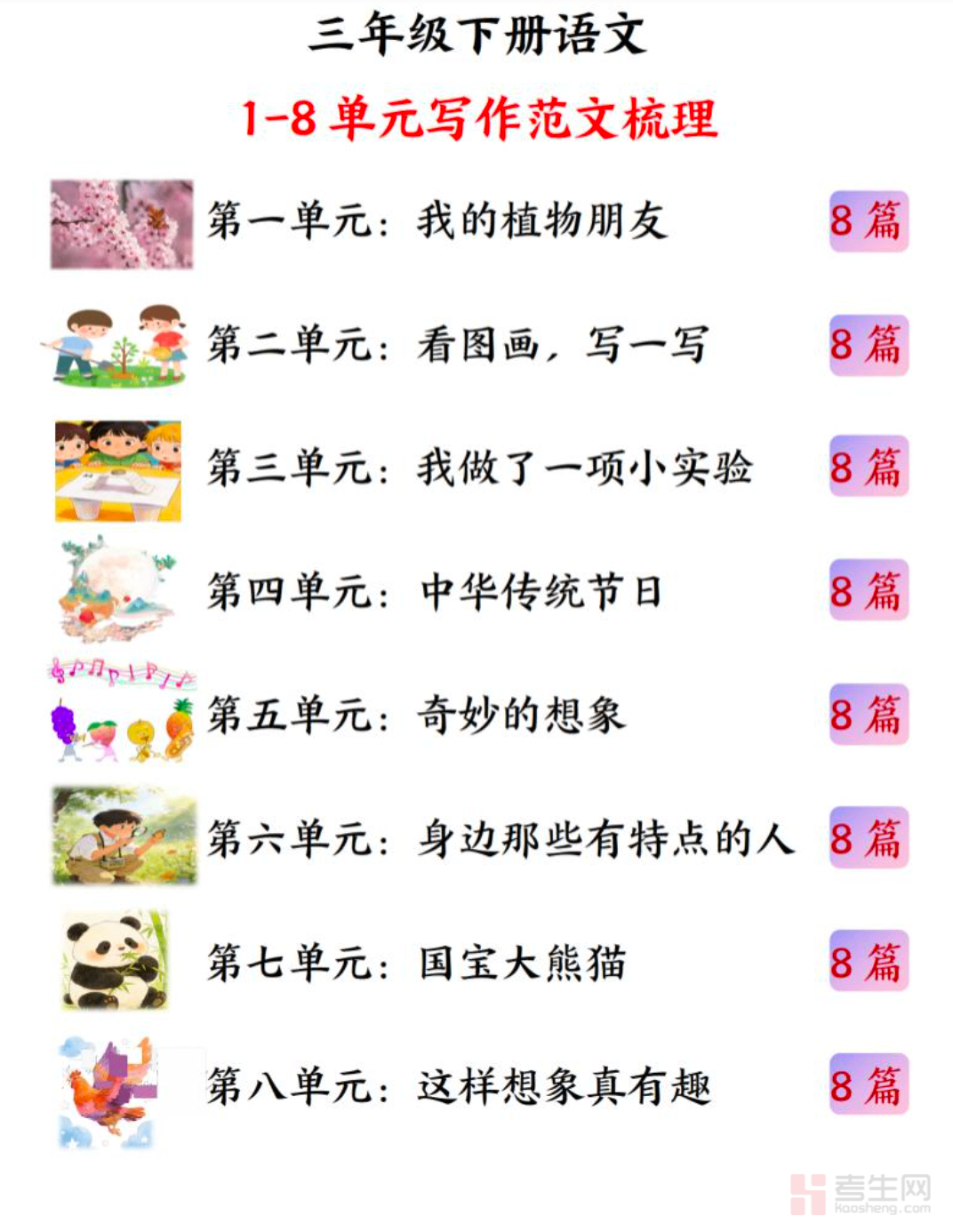 26 春小学语文 1-8 单元作文优秀范文(三年级下)严格同步 2026 年春季三年级下册语文教材单元习作要求,覆盖看图写话、写人、记事、写景、状物、日记等低年级重点作文类型,每篇范文篇幅适中、语句通顺、内容浅显易懂,贴合三年级起步写作水平。范文突出简单结构、规范表达、好词好句、生动细节,搭配清晰写作提示,帮助孩子快速掌握审题、选材、分段、表达的基本方法,有效积累写作素材、培养写作兴趣。适合三年级学生课堂习作参考、日常仿写、单元复习、作文提升使用,轻松打好写作基础。请添加微信 18617049513 进专属群,获取更多免费资源!