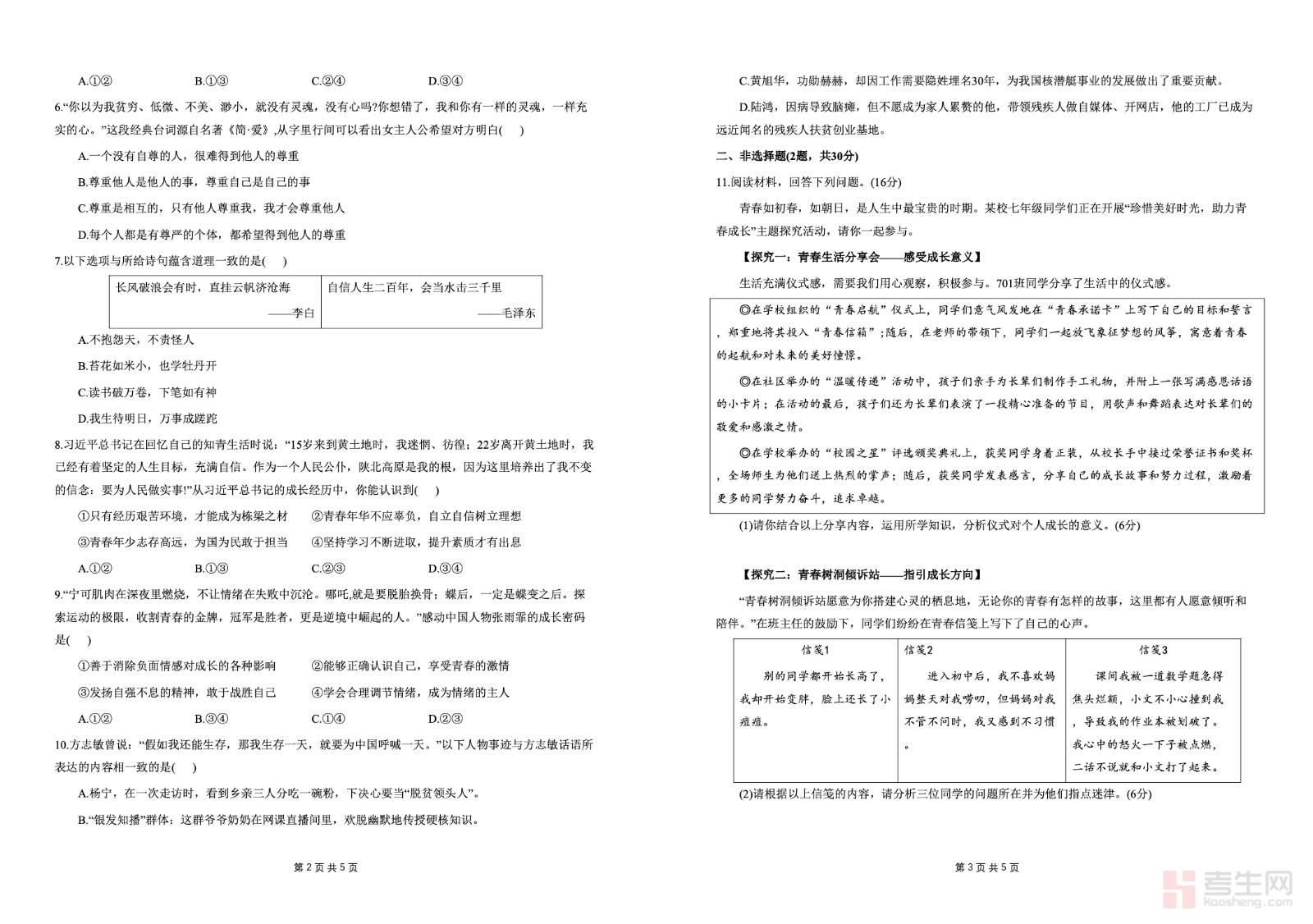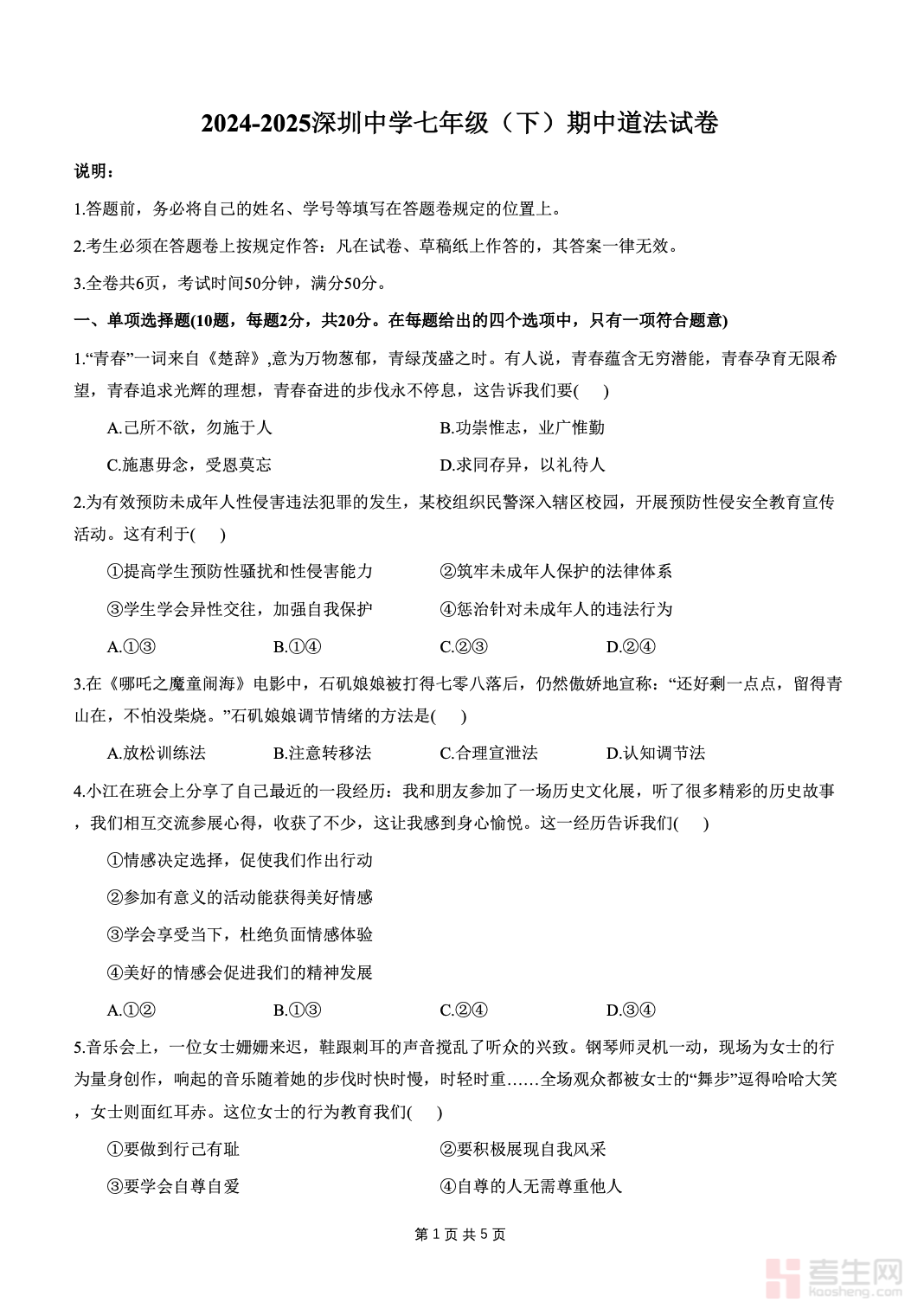 2024-2025 深圳中学七年级(下)期中道法试卷(含答案解析)精准贴合深圳中学期中命题标准,适配统编版七年级下册道法教材,聚焦期中核心考查范围,涵盖青春期心理、情绪调控、自尊自信、人际交往、中华优秀传统文化等重点知识点,贴合深圳本地学情与中考命题趋势。试卷题型规范,包含选择、材料分析、简答题等,难度梯度合理,还原深圳中学真实期中考试场景,配套详细答案解析,精准拆解答题思路、标注得分要点,帮助学生理清解题逻辑、规避答题误区。适合深圳地区七年级学生期中备考、模拟演练、查漏补缺、答题技巧提升,同时为家长辅导、教师备课提供可靠参考,助力夯实道法基础,精准应对期中检测。请添加微信 18617049513 进专属群,获取更多免费资源!