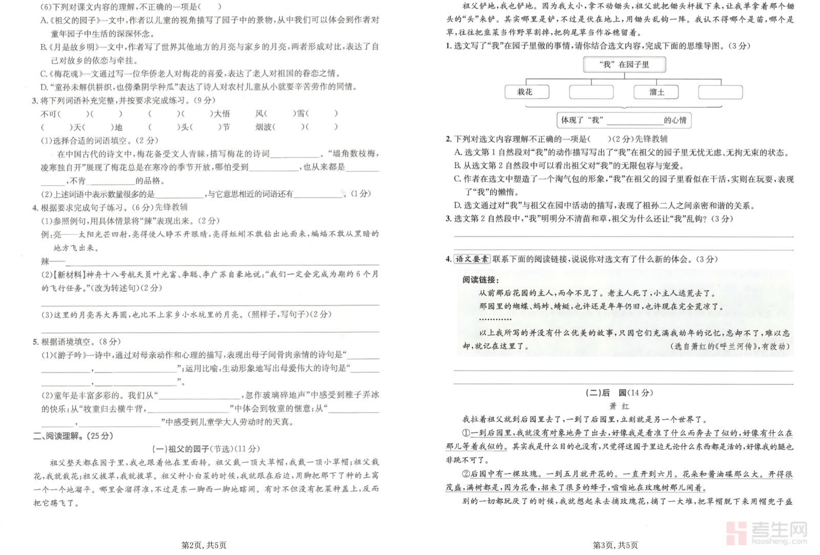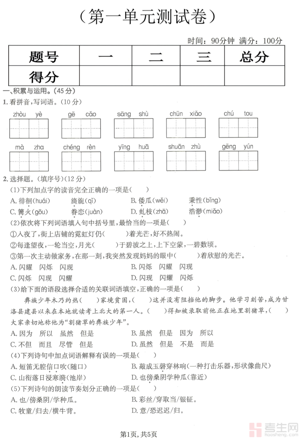 小学语文 第一单元 拔尖检测卷(五年级下)紧扣部编版五年级下册语文第一单元教材内容与单元教学重点,贴合小学中段学情与单元测试要求,全面覆盖字词听写、近义词反义词、句式转换、课文内容理解、课内阅读、课外阅读、习作等核心考查内容。试卷难度设计合理,侧重基础巩固与能力拔高,突出对语言积累、阅读理解、表达运用等核心素养的考查,题型规范、考点全面,适合五年级学生单元自检、拔尖训练、查漏补缺、巩固提升使用,能有效检验学习效果,强化单元重难点,提升语文综合能力与应试水平。请添加微信 18617049513 进专属群,获取更多免费资源!