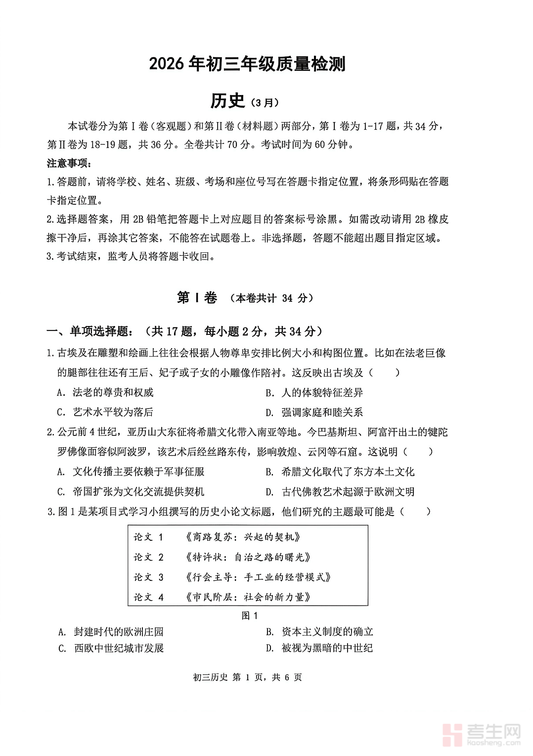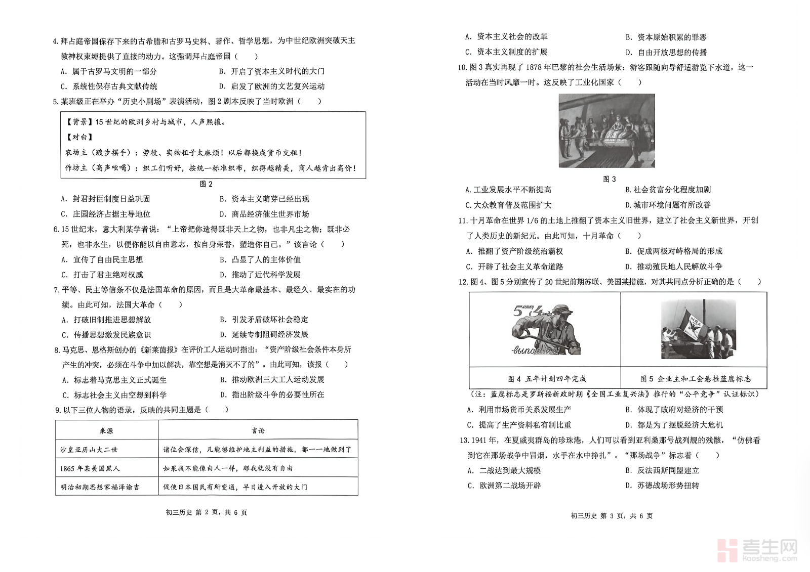 2026 年深圳市 34 校初三联考中考一模历史试卷(含答案解析)严格对标深圳 34 校联考命题标准与 2026 年深圳中考历史考情,覆盖中国古代史、中国近代史、中国现代史、世界近代史、世界现代史核心模块,聚焦史料实证、历史解释、时空观念、家国情怀四大核心素养。试卷包含选择、材料分析、综合探究等完整题型,贴合开卷考试特点,注重考查材料解读、信息提取、知识迁移、规范答题能力,还原联考真实难度与命题思路。配套详细答案解析,逐题点明得分要点、易错陷阱与答题模板,帮助学生精准查漏补缺。适合深圳初三学生一模模拟、水平定位、专题突破、中考冲刺,快速把握历史命题趋势,提升应试得分能力。请添加微信 18617049513 进专属群,获取更多免费资源!