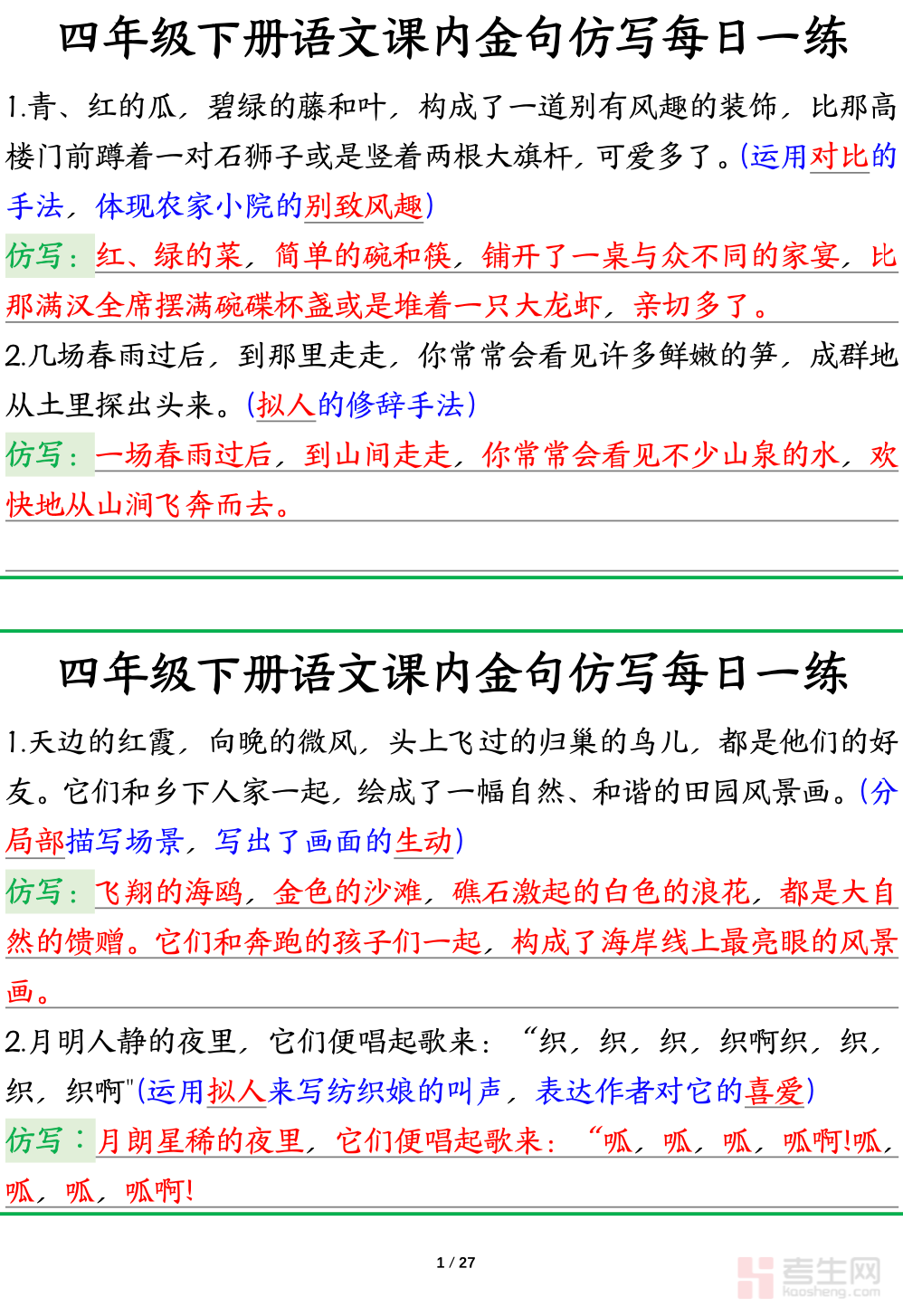 四年级(下)语文 金句仿写紧扣部编版四年级下册语文教材课文中的优美语句与经典句式,围绕比喻、拟人、排比、夸张等常见修辞手法,精选课本高频金句,采用例句示范 + 思路点拨 + 仿写练习的模式,由浅入深引导学生掌握句子结构与表达技巧。内容贴合四年级写作要求,重点提升语言运用、句子优美度、文采表达、作文加分能力,帮助学生快速积累好词好句,告别作文干巴巴。题型实用、针对性强,适合学生日常练习、作文提升、句式巩固、考前积累,有效增强语言表达能力,为习作打下扎实基础。请添加微信 18617049513 进专属群,获取更多免费资源!
