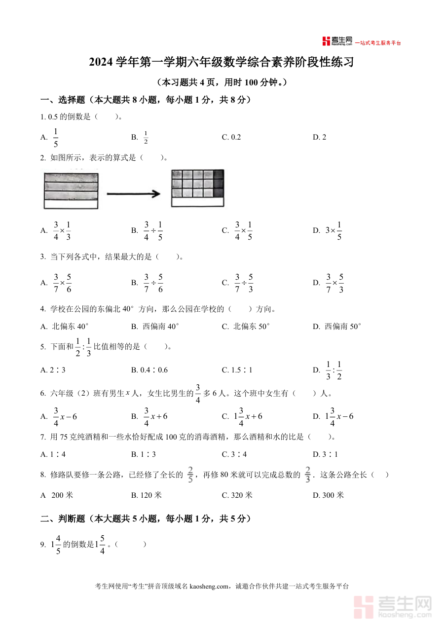 《精品解析:2024-2025学年广东省广州市白云区广州市云雅实验学校人教版六年级上册期中测试数学试卷(原卷版)》是针对2024-2025学年广东省广州市白云区广州市云雅实验学校六年级上册数学学科期中测试设计的原卷版备考资料,符合人教版教材教学进度与要求,包含该学年该地区该校对应年级上册数学期中测试的标准试卷内容,为师生提供贴合本地教学实际和学校考查要求的权威参考依据。