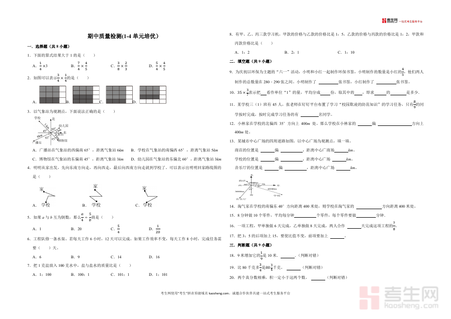 适用人群主要为广东省广州市2023-2024学年六年级的学生、数学学科教师及学生家长。对于学生而言,它能支持针对性复习与强化训练,帮助巩固已学知识并弥补不足;对于教师而言,可作为阶段检测的补充资源,辅助评估教学效果并调整教学计划;对于家长而言,能帮助监督孩子的学习进度与效果,共同推进期中备考准备工作。