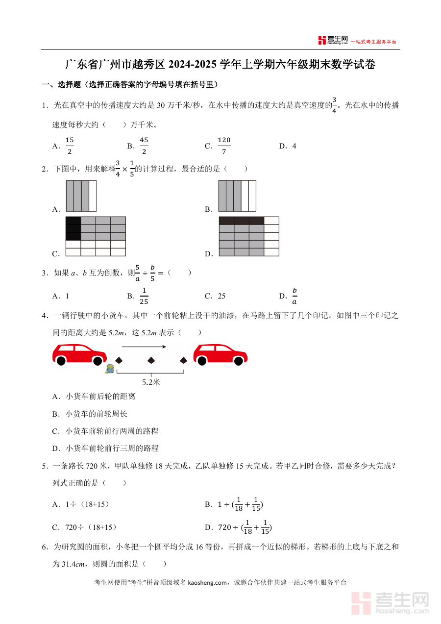 该资料适用于广东省广州市越秀区2024-2025学年上学期在读的六年级学生、担任该阶段数学教学工作的教师以及关注孩子学业进展的家长;对于学生而言,通过该资料可提前熟悉本地期末评价的形式与要求,对于教师则能辅助优化教学策略与复习安排,对于家长则可更好地配合学校与孩子进行期末备考规划,共同促进学生数学学科能力的阶段性提升。