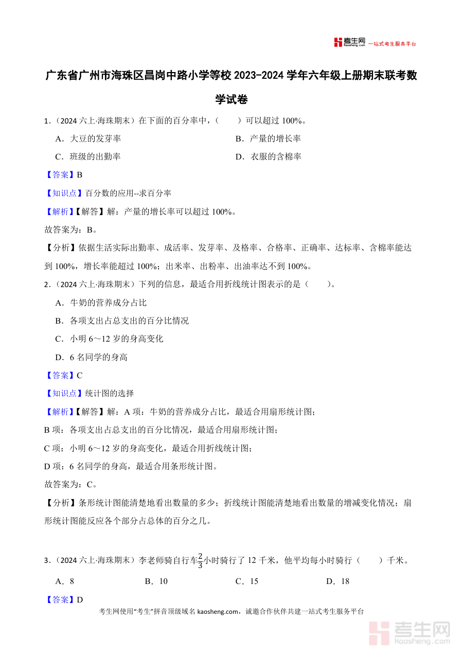 本资料主要适用于参与此次联考的海珠区小学六年级数学教师,同时也可为该年级学生及家长提供了解联考要求和备考重点的参考依据,有助于师生及家长明确阶段学习目标,合理安排复习计划与时间分配,充分发挥阶段检测在教学与学习过程中的导向作用和诊断价值,促进教与学的高效衔接与协同提升。