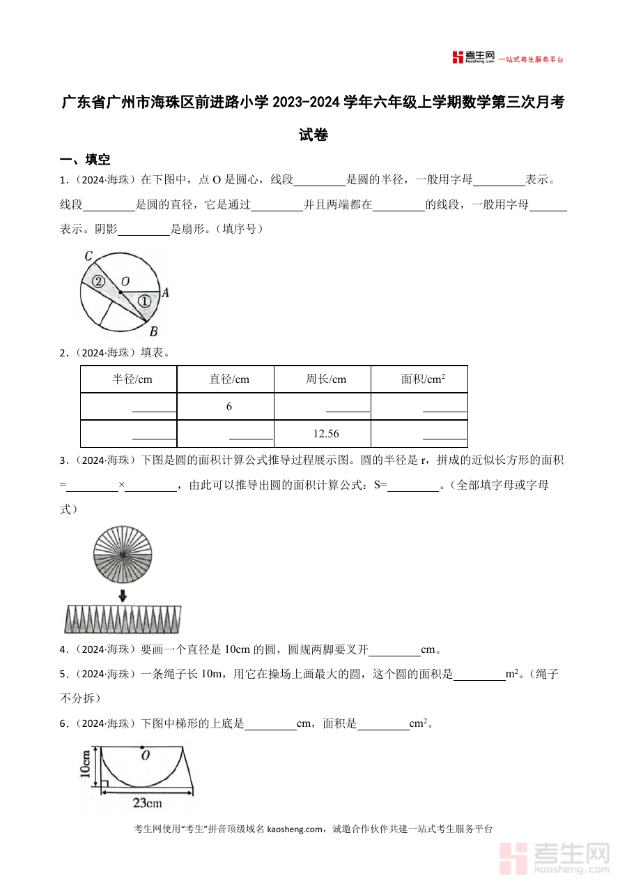 《广东省广州市海珠区前进路小学2023-2024学年六年级上学期数学第三次月考试卷(学生版)》是针对2023-2024学年广东省广州市海珠区前进路小学六年级上学期数学学科第三次月考设计的学生端备考资料,反映了该阶段学校数学教学的阶段性考查需求。