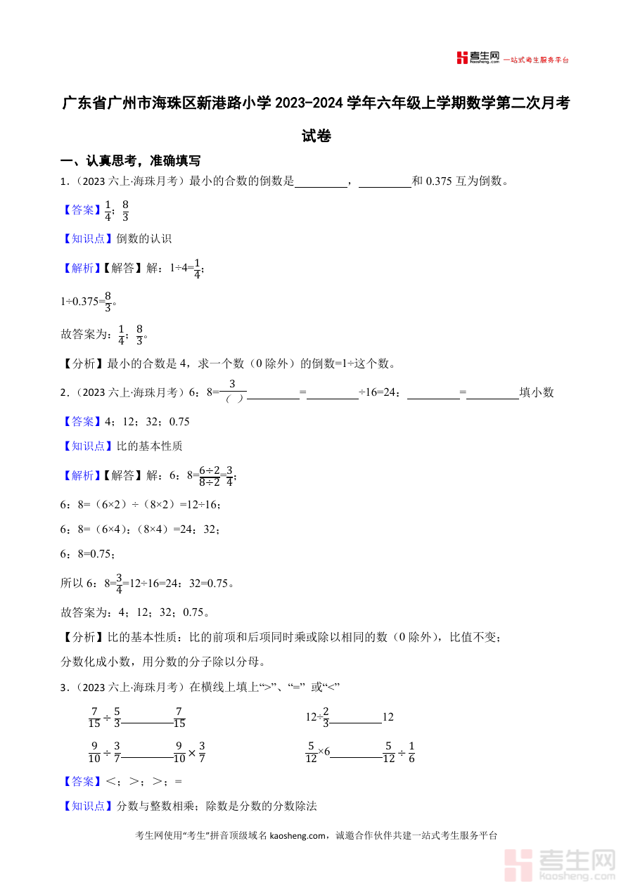 《广东省广州市海珠区新港路小学2023-2024学年六年级上学期数学第二次月考试卷(教师版)》是针对广东省广州市海珠区新港路小学特定学年学期的数学阶段性考试资料,聚焦六年级上学期第二次月考这一关键节点,为相关教学活动提供了贴合该校学情的参考依据。作为教师版资料,它承载了对该次考试内容的专业梳理与呈现,是适配该学校该阶段数学教学进度与考试需求的重要备考辅助材料。