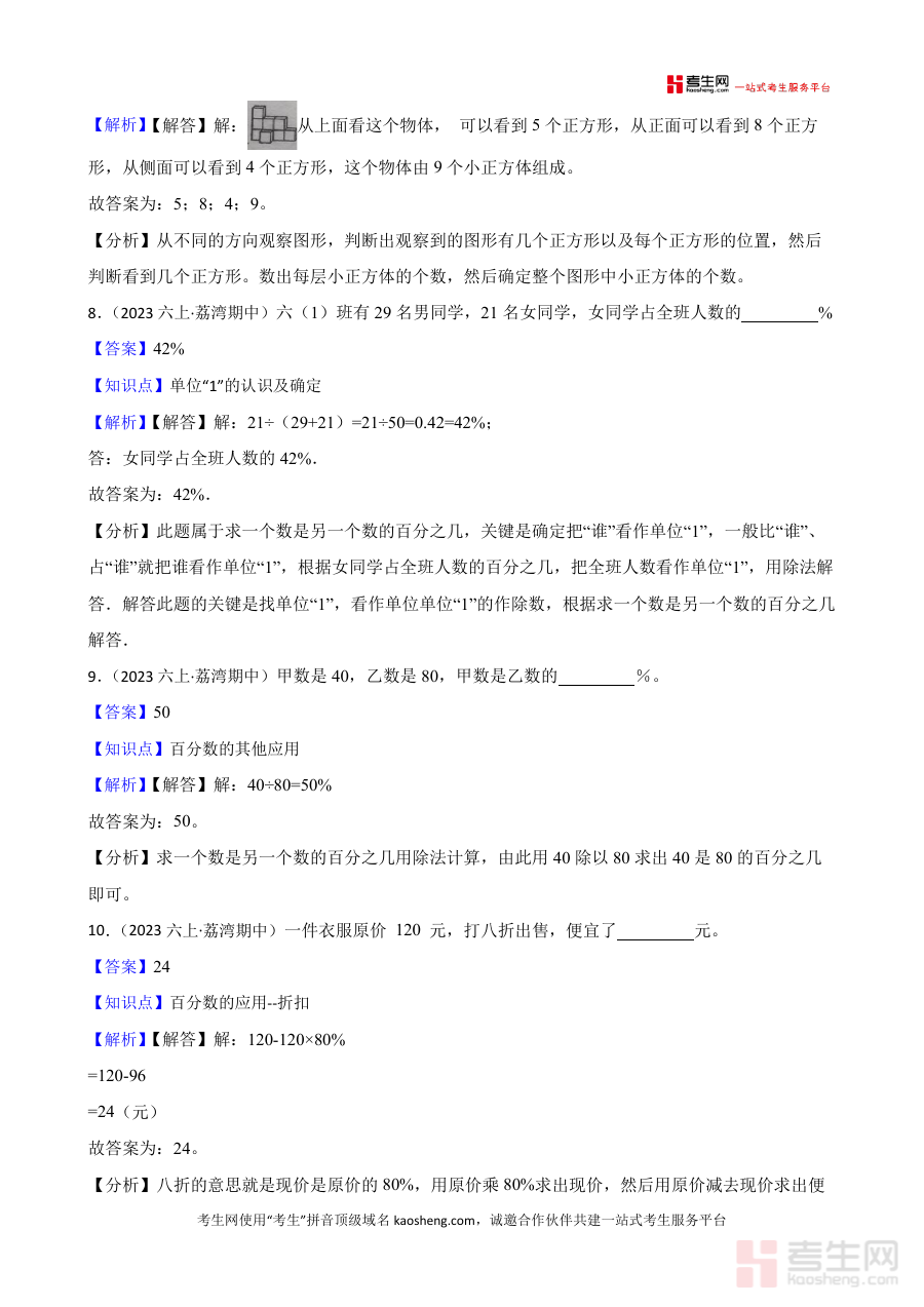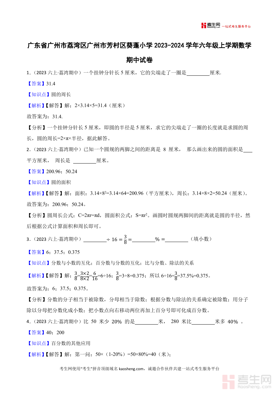 《广东省广州市荔湾区广州市芳村区葵蓬小学2023-2024学年六年级上学期数学期中试卷(教师版)》是2023至2024学年上学期针对广东省广州市荔湾区芳村区葵蓬小学六年级学生设计的数学期中检测教师专用资料属于该学校特定学期数学学科期中考试的配套教师版本材料可作为该阶段数学教学与备考的重要参考依据