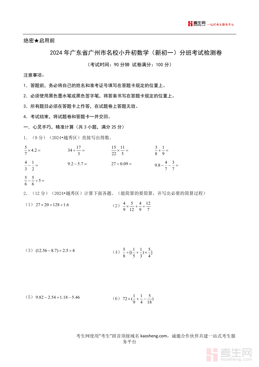 本资料适用于广东省广州市即将升入初一、计划参加当地名校分班考试的数学学习者,以及指导这些学生的教师和家长;其核心价值在于通过贴合目标考试的检测内容,助力学生提前适应分班考试要求,为新初中阶段学习做好准备,同时辅助教师和家长更精准地开展备考指导与规划工作。