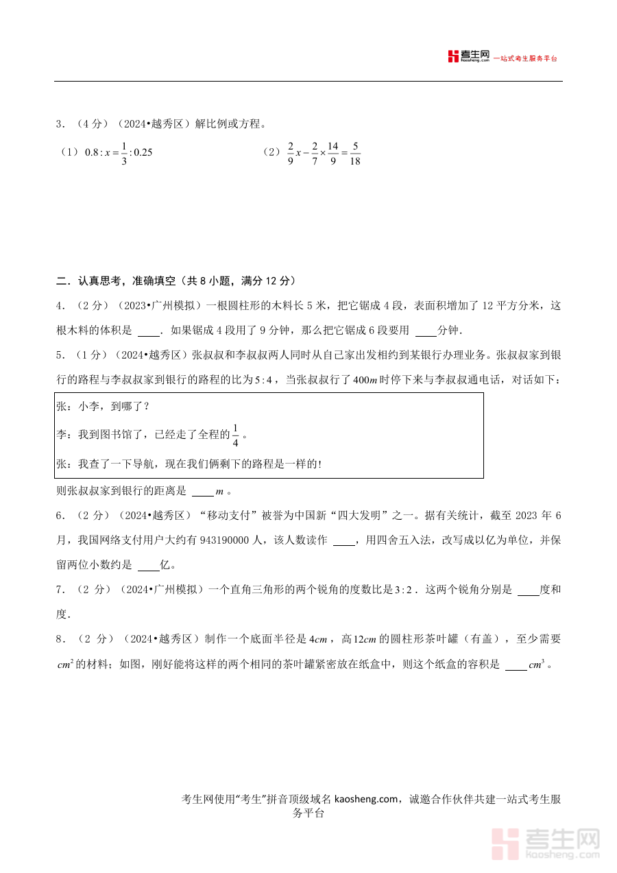 《2024年广东省广州市名校小升初数学(新初一)分班考试检测卷(人教版)A4原卷》是2024年面向广东省广州市地区名校小升初衔接阶段数学学科的分班考试备考资料,依托人教版教材体系设计,契合当地教育教学实际,为相关考试提供针对性的练习支持。