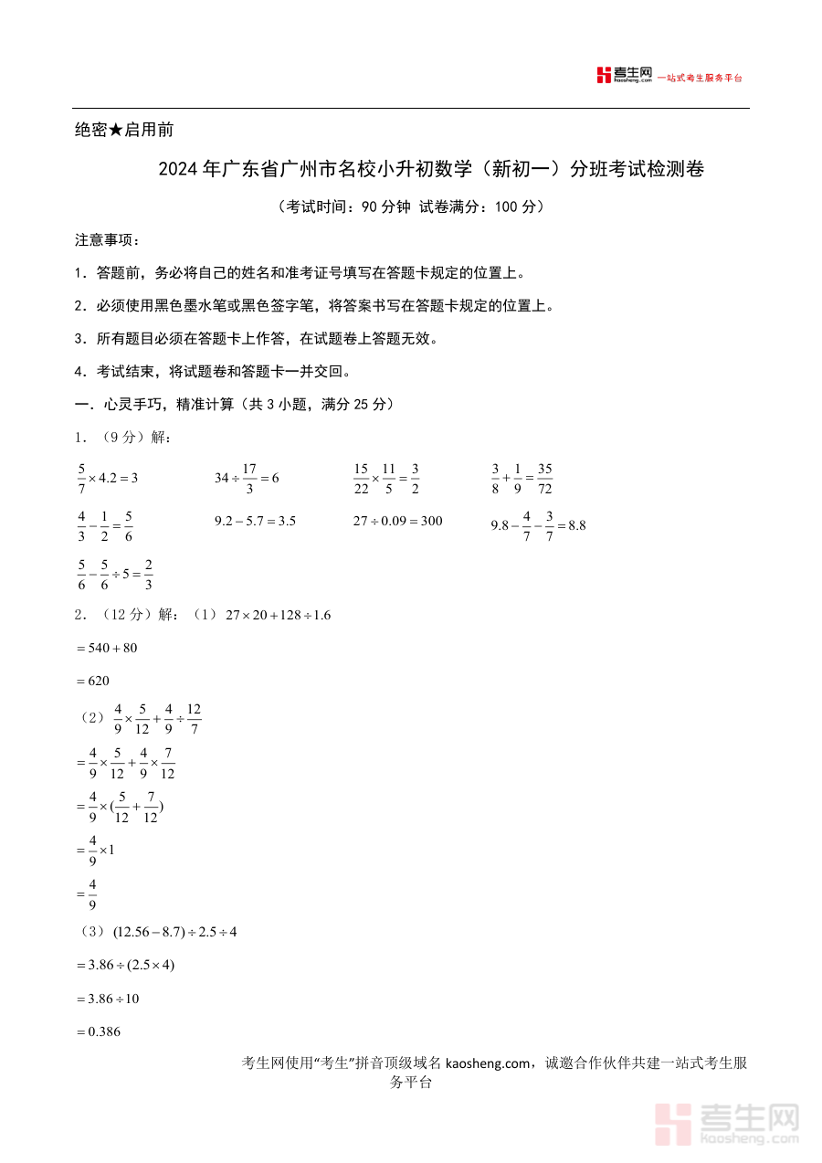 本资料主要适用于2024年准备参加广东省广州市名校新初一数学分班考试的学生、学生家长及辅导教师,通过参考该资料,使用者能够更清晰地把握考试的答题规范与评分导向,提升备考的针对性与有效性,为顺利适应初中数学学习奠定基础。