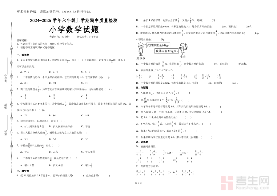此资料适用于2024-2025学年六年级上册的数学学习者,以及从事相关教学工作的教师和学生家长;通过使用该资料,学生能够强化对重点难点内容的理解与运用,提升期中备考的效率与针对性,教师和家长则可借助其精准把握学生学习薄弱环节,优化教学或辅导策略。
