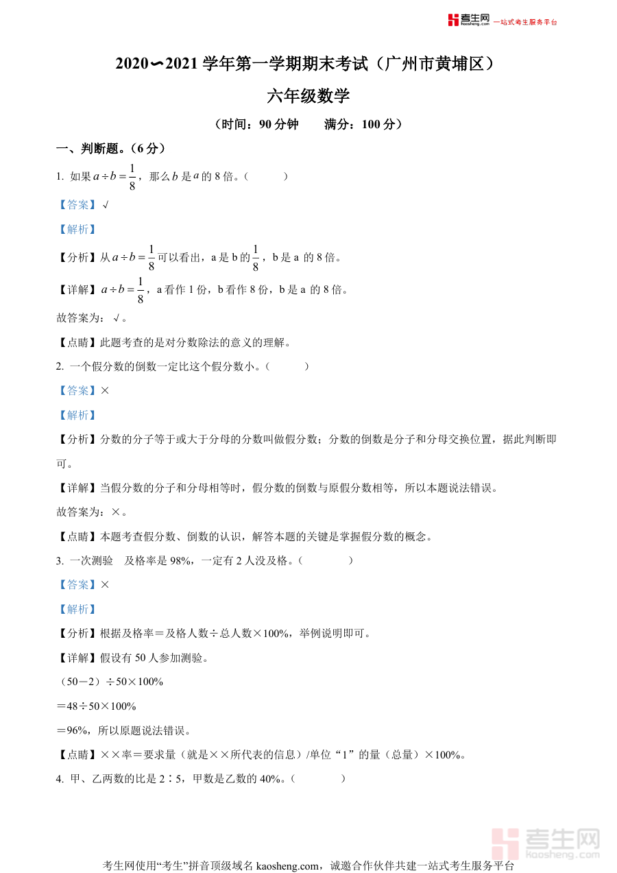 《精品解析:2020-2021学年广东省广州市黄浦区人教版六年级上册期末测试数学试卷(解析版)》是针对2020至2021学年广东省广州市黄浦区六年级上册数学期末测试的备考资料,聚焦该地区该学年的期末测评需求,为使用者提供与本地考试实际情况匹配的参考内容。