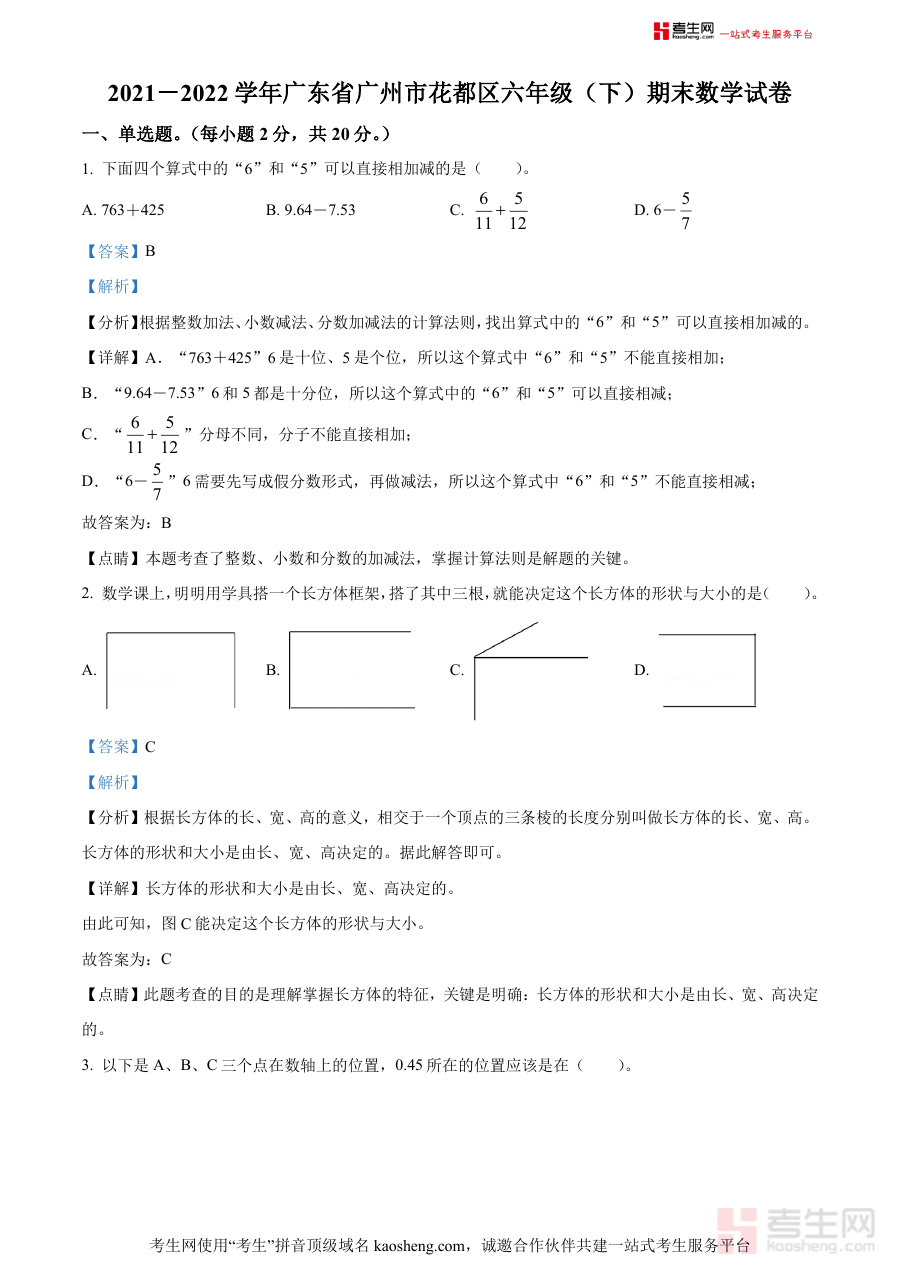 《精品解析:2021-2022学年广东省广州市花都区人教版六年级下册期末测试数学试卷(解析版)》是针对2021-2022学年广东省广州市花都区区域内,使用人教版教材的六年级学生期末数学测试设计的专业备考资料。该资料结合当地期末测试的命题特点与教学要求,以解析版形式呈现相关内容,为使用者提供贴合本地教学实际的复习参考依据。