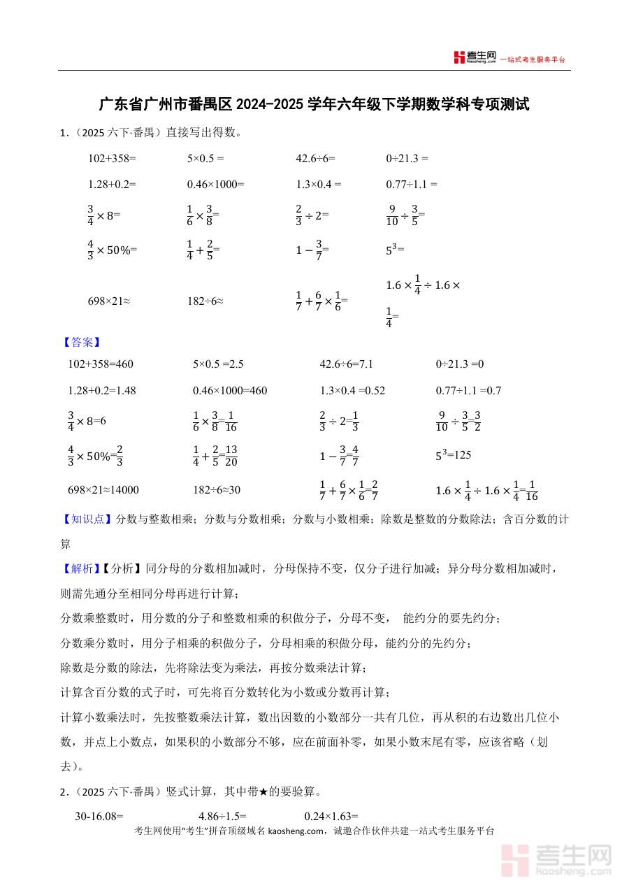 《广东省广州市番禺区2024-2025学年六年级下学期数学科专项测试(教师版)》是针对广东省广州市番禺区2024至2025学年第二学期六年级学生数学学科专项测试设计的教师专用资料,聚焦该学年该地区六年级下学期数学专项测试的教学需求,为教师提供与专项测试相关的专业辅助内容,助力教师精准对接测试要求,开展高效的教学准备工作。