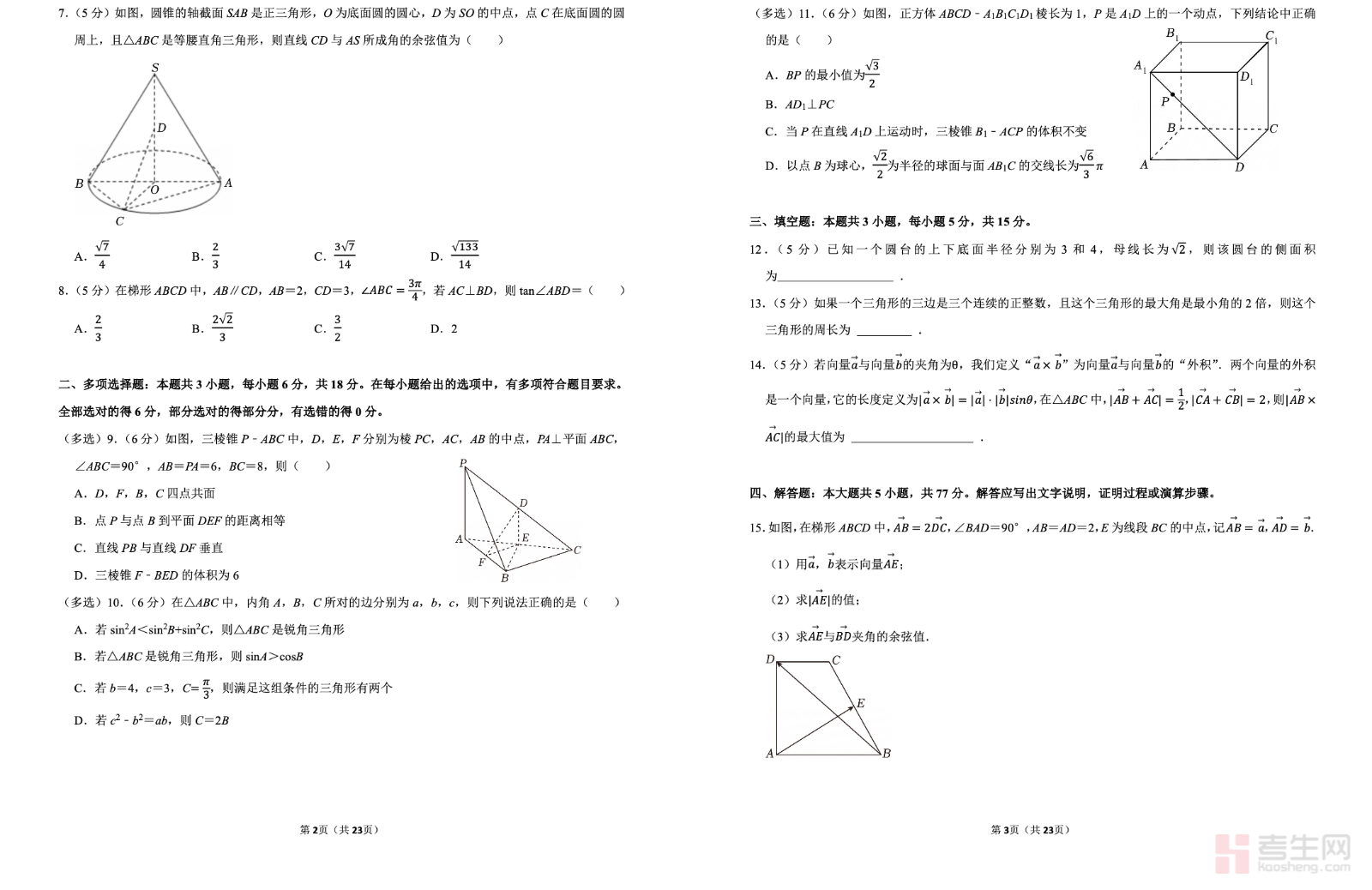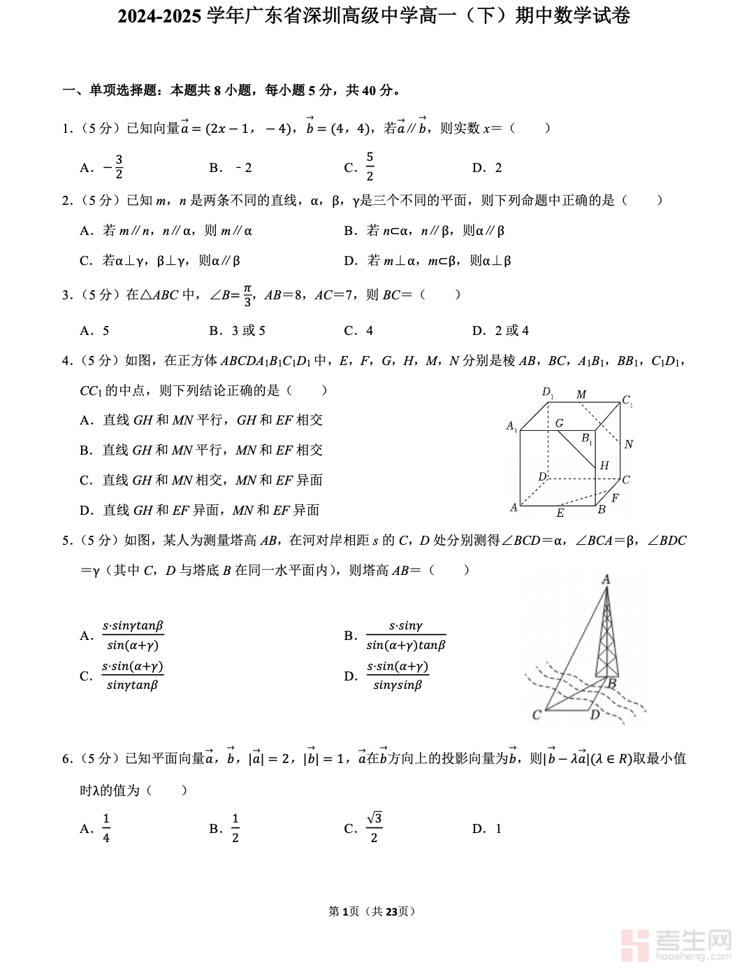 2024-2025 学年广东省深圳高级中学高一(下)期中数学试卷严格对标该校教学进度与新高考命题方向,全面覆盖平面向量、三角函数、解三角形、空间立体几何核心考点,包含单选、多选、填空、解答完整题型,注重考查逻辑推理、空间想象、运算求解、知识综合应用能力。试卷难度梯度合理,贴合深圳高级中学期中检测标准,精准还原考场命题思路与高频考法,配套详细答案解析,逐题点明解题步骤、得分要点与易错陷阱,适合高一学生期中备考、自测定位、专题巩固、查漏补缺,快速夯实数学基础,提升应试能力与学科素养。请添加微信 18617049513 进专属群,获取更多免费资源!