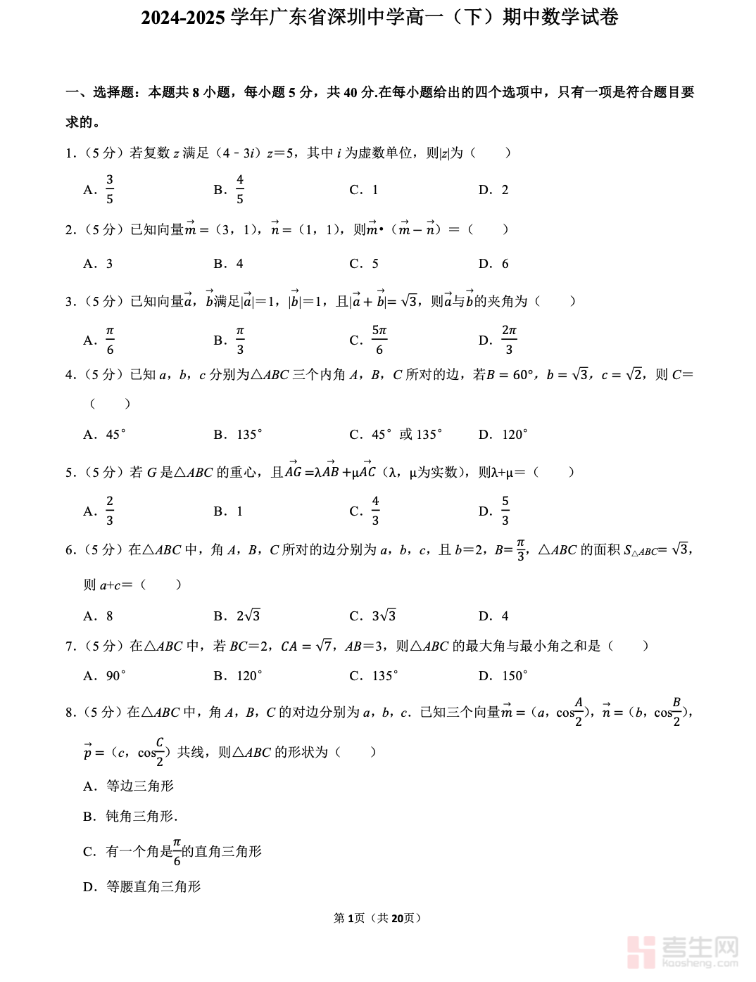 2024-2025 学年广东省深圳中学高一(下)期中数学试卷严格对标深圳中学教学进度与新高考命题方向,全面覆盖平面向量、三角函数、解三角形、复数、空间立体几何核心考点,包含单选题、多选题、填空题、解答题完整题型,试卷满分 150 分、考试时长 120 分钟,深度考查逻辑推理、运算求解、空间想象、知识综合应用能力。试卷贴合深中校内检测难度,精准还原命题思路与高频考法,配套详细答案解析,逐题点明解题步骤、得分要点与易错陷阱,适合高一学生期中备考、自我检测、专题巩固、查漏补缺,快速夯实数学基础,提升应试能力。请添加微信 18617049513 进专属群,获取更多免费资源!