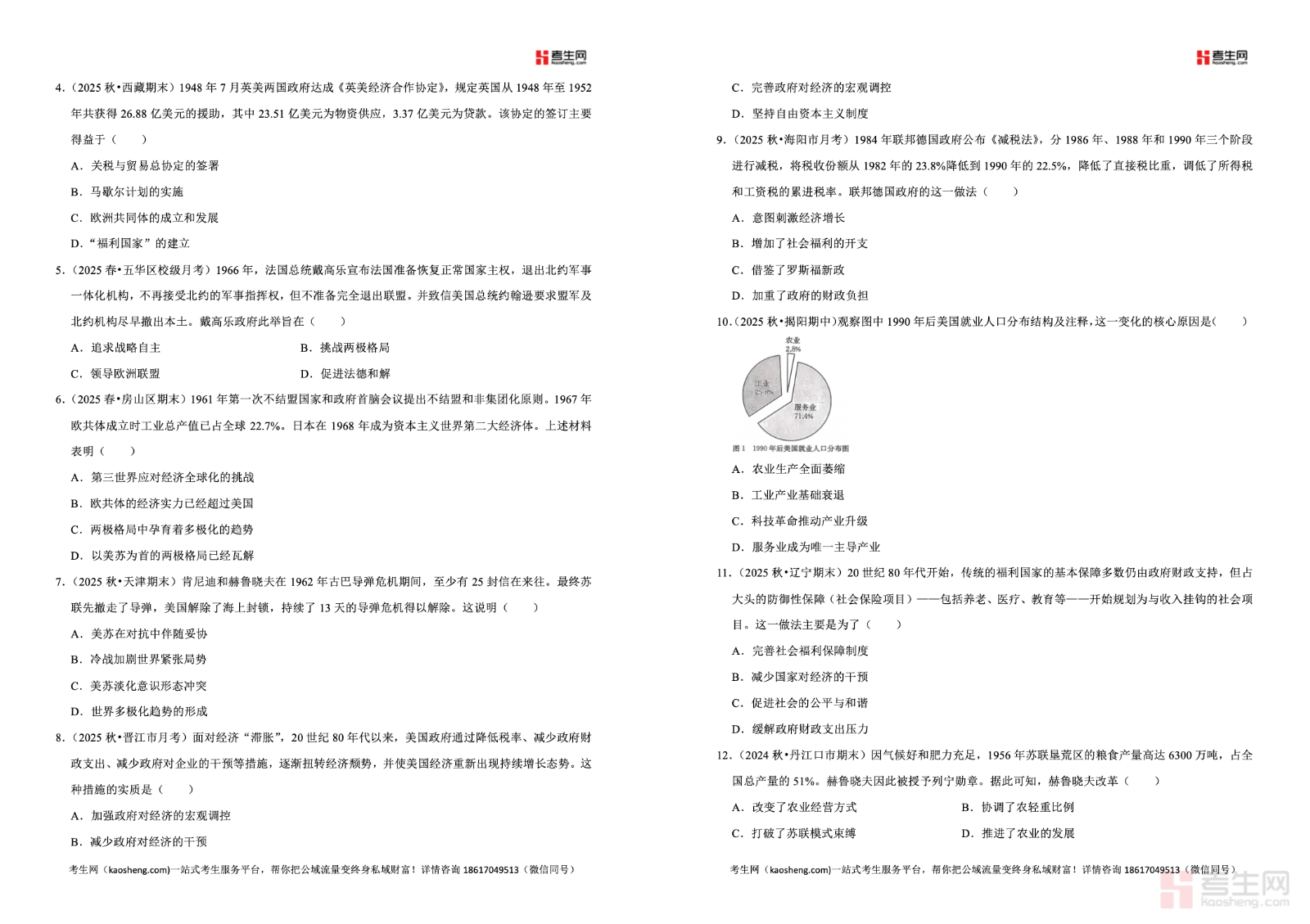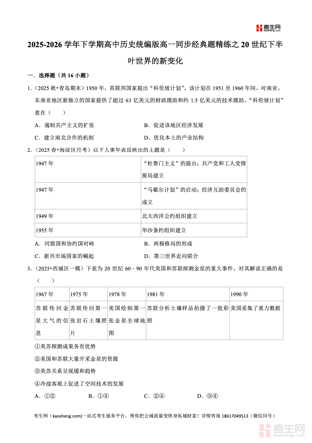 2025-2026 学年下学期高中历史统编版高一同步经典题精练之 20 世纪下半叶世界的新变化严格依据统编版高中历史教材编写,紧扣高一历史下学期教学进度与考点要求,聚焦20 世纪下半叶世界的新变化核心专题,全面覆盖冷战与国际格局演变、资本主义国家新变化、社会主义国家改革与发展、新兴民族国家发展等重点内容。精选同步经典题、基础巩固题、能力提升题、真题变式题,题型全面、贴合考情,注重考查时空观念、史料实证、历史解释、家国情怀核心素养,答案解析详细透彻,帮助学生巩固课堂知识、强化解题思路、突破学习难点。适合高一学生同步练习、单元复习、期中期末备考使用,快速提升历史解题能力与应试水平。请添加微信 18617049513 进专属群,获取更多免费资源!