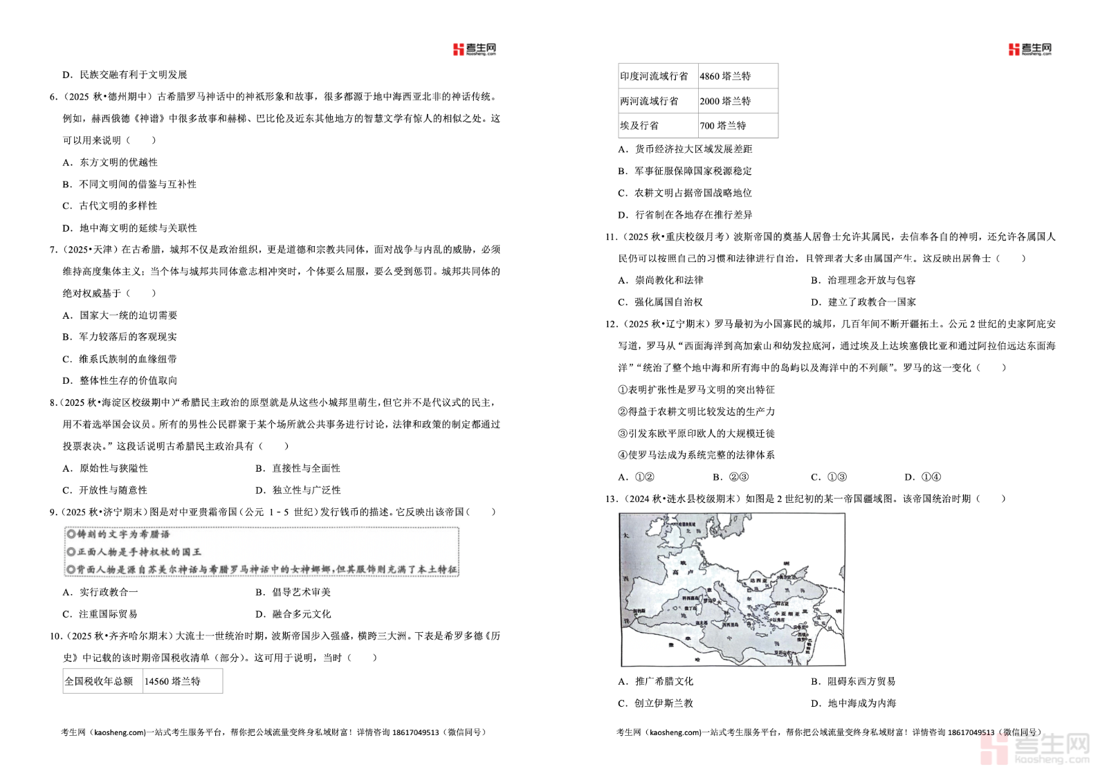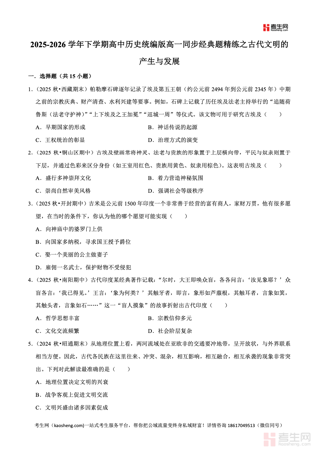 2025-2026 学年下学期高中历史统编版高一同步经典题精练之古代文明的产生与发展严格依据统编版高中历史教材与高一教学进度编写,紧扣古代文明的产生与发展核心专题,全面覆盖人类文明的起源、古代西亚与埃及文明、古代印度与希腊文明、古代文明的交流等高频考点。精选同步基础题、典型例题、真题变式题、能力提升题,题型全面、考点精准,着重强化时空观念、史料实证、历史解释等核心素养,每道题配有详细解析,理清解题思路、点明易错点。适合高一学生课堂同步练习、单元巩固、期中期末复习使用,有效夯实历史基础,提升解题能力与应试水平。请添加微信 18617049513 进专属群,获取更多免费资源!