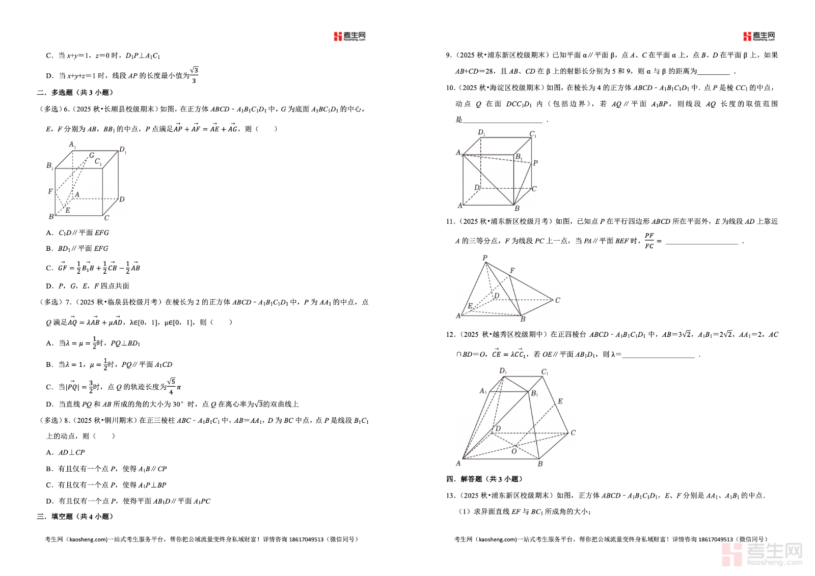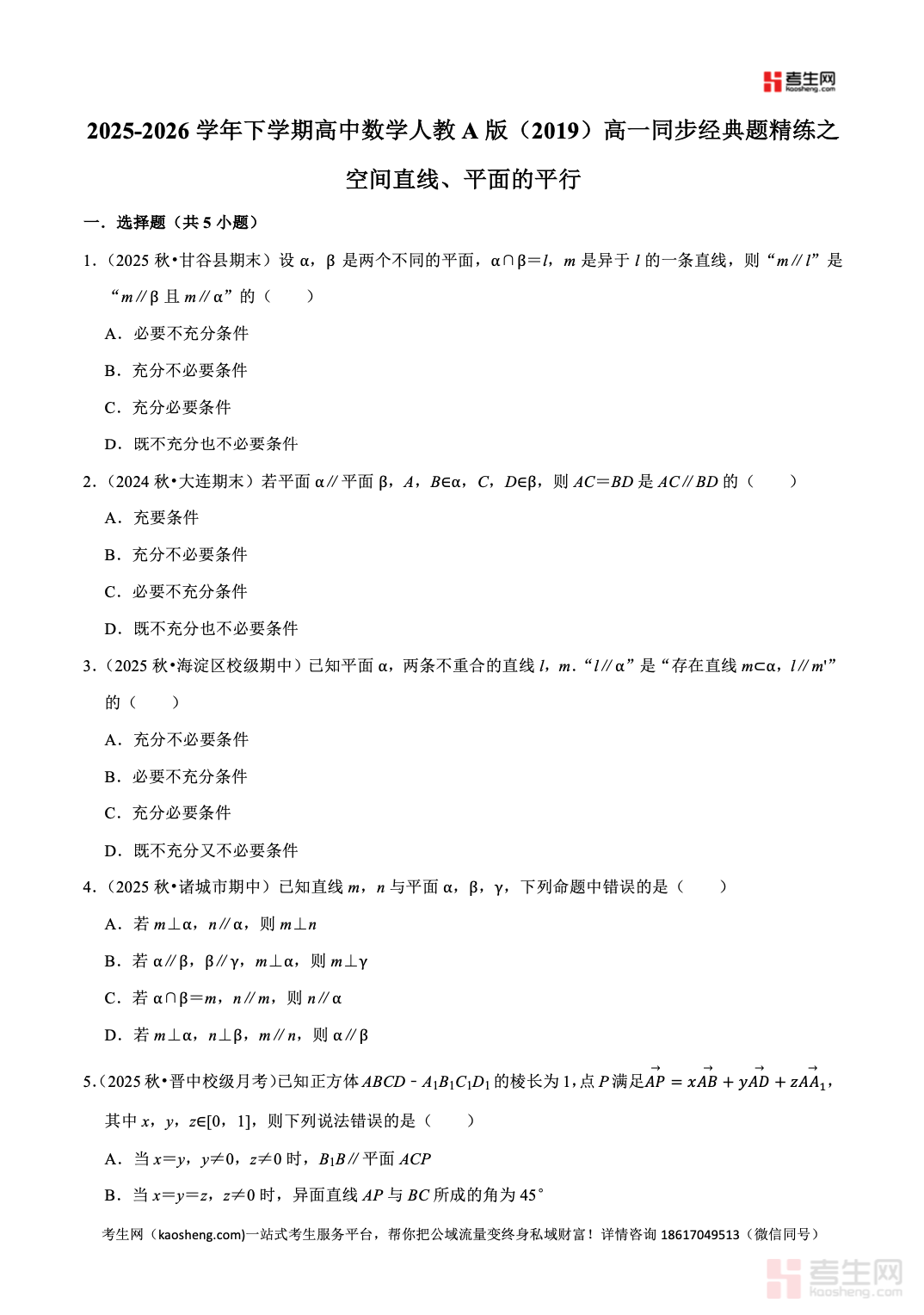 2025-2026 学年下学期高中数学人教 A 版(2019)高一同步经典题精练之空间直线、平面的平行严格依据人教 A 版 2019 高中数学教材及高一下学期教学进度编写,聚焦空间直线、平面的平行核心专题,全面覆盖线线平行、线面平行、面面平行的判定定理与性质定理、平行关系的综合证明与应用等关键考点。精选同步基础题、典型例题、易错辨析题、综合提升题,题型全面、梯度合理,着重强化空间想象、逻辑推理、几何证明、规范答题核心能力,每道题配有详细解析,理清思路、点明易错点与解题技巧。适合高一学生课堂同步练习、课后巩固、单元复习、期中期末备考,夯实立体几何基础,提升数学解题与应试水平。请添加微信 18617049513 进专属群,获取更多免费资源!