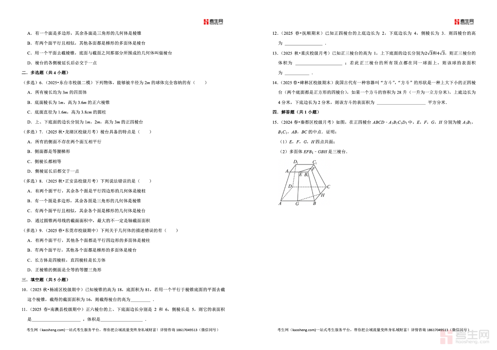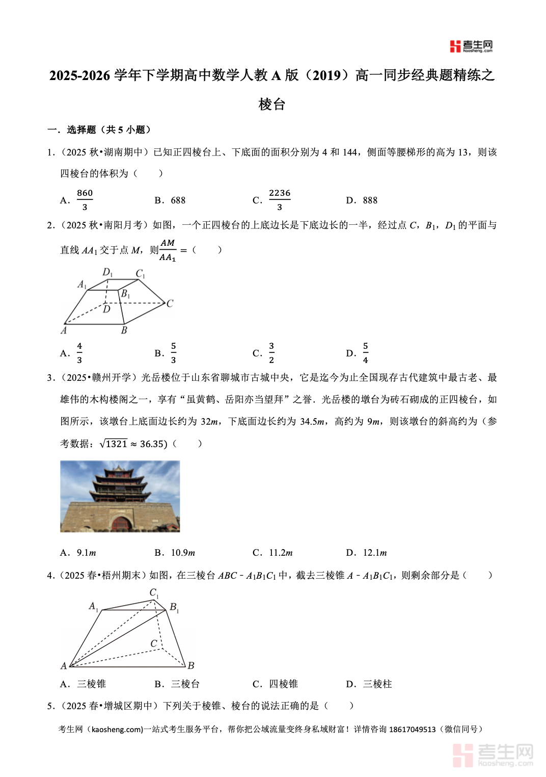 2025-2026 学年下学期高中数学人教 A 版(2019)高一同步经典题精练之棱台严格依据人教 A 版 2019 高中数学教材及高一下学期教学进度编写,聚焦棱台核心专题,全面覆盖棱台的定义与结构特征、棱台的表面积计算、棱台的体积公式、棱台与棱柱棱锥的转化关系等高频考点。精选同步基础题、典型例题、易错辨析题、综合应用题,梯度合理、考点精准,着重强化空间想象、运算求解、逻辑推理、几何直观核心能力,每道题配有详细解析,理清思路、点明易错点与解题技巧。适合高一学生课堂同步练习、课后巩固、单元复习、查漏补缺,夯实立体几何基础,提升数学解题与应试水平。请添加微信 18617049513 进专属群,获取更多免费资源!