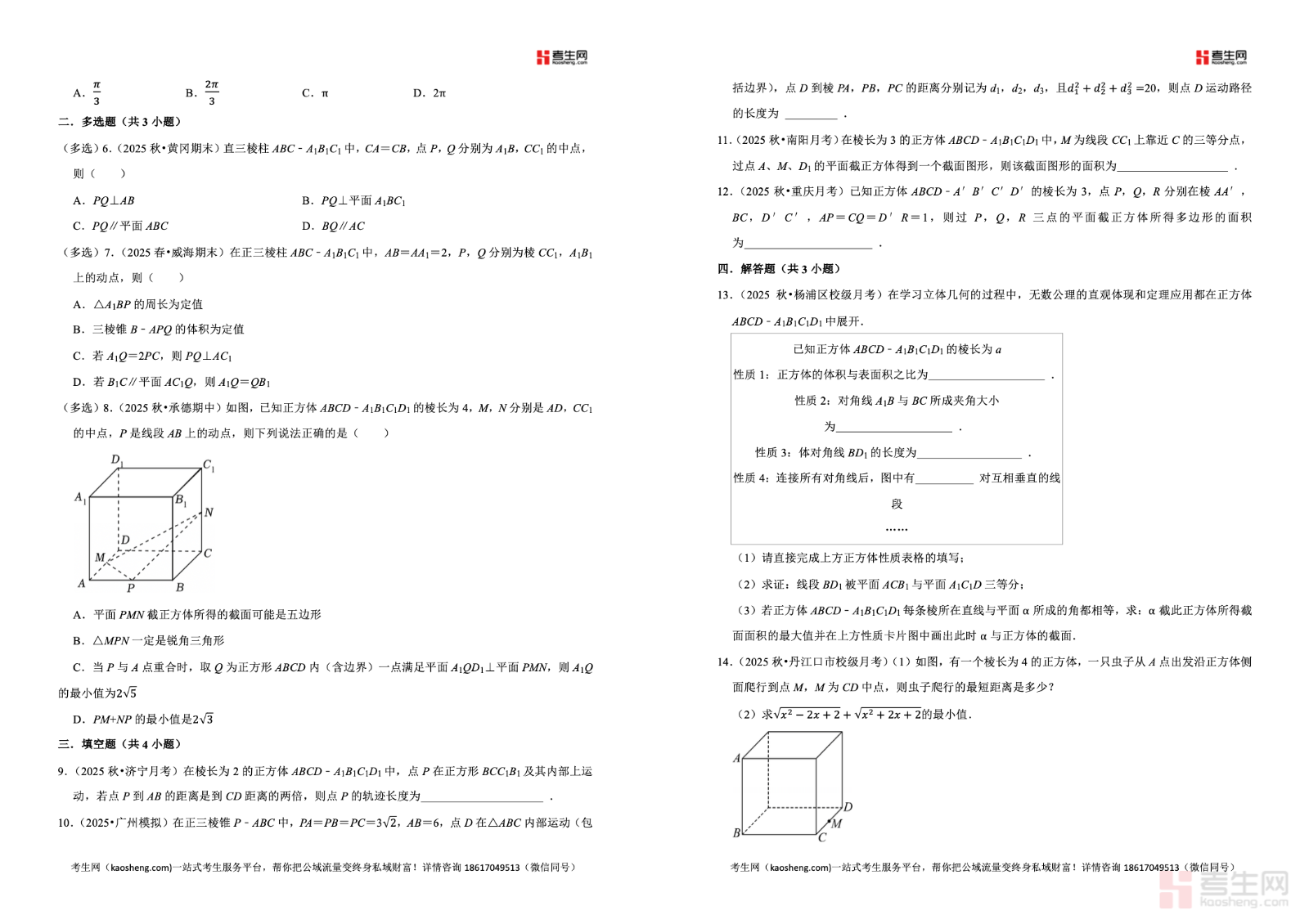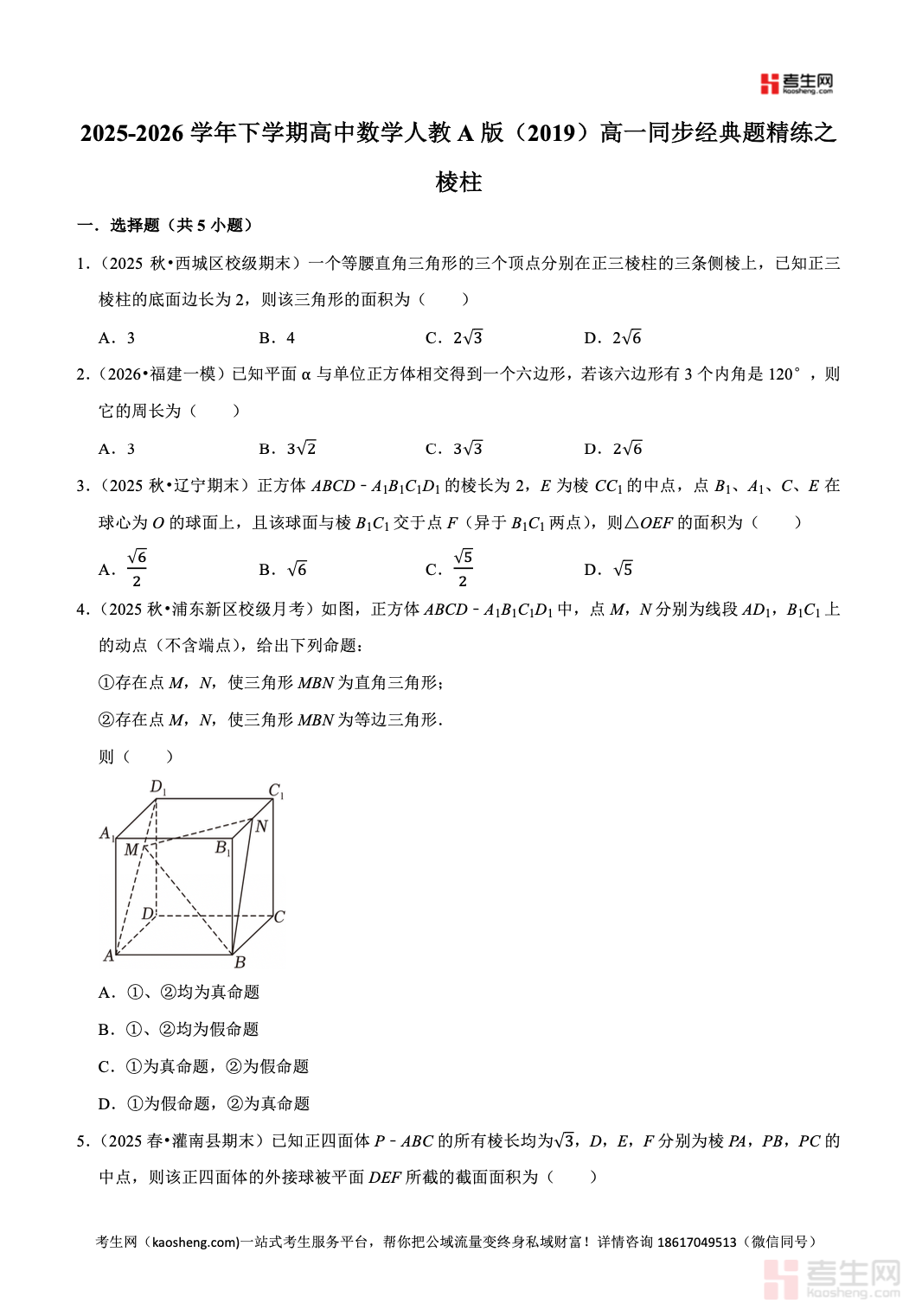 2025-2026 学年下学期高中数学人教 A 版(2019)高一同步经典题精练之棱柱严格依据人教 A 版 2019 高中数学教材及高一下学期教学进度编写,聚焦棱柱核心专题,全面覆盖棱柱的定义与结构特征、棱柱的分类、表面积计算、体积公式、直观图与截面问题等高频考点。精选同步基础题、典型例题、易错变式题、综合应用题,梯度清晰、考点精准,着重强化空间想象、运算求解、逻辑推理、几何建模核心素养,每道题配有详细解析,理清思路、点明易错点与解题技巧。适合高一学生课堂同步练习、课后巩固、单元复习、考前查漏补缺,夯实立体几何基础,提升数学解题与应试能力。请添加微信 18617049513 进专属群,获取更多免费资源!