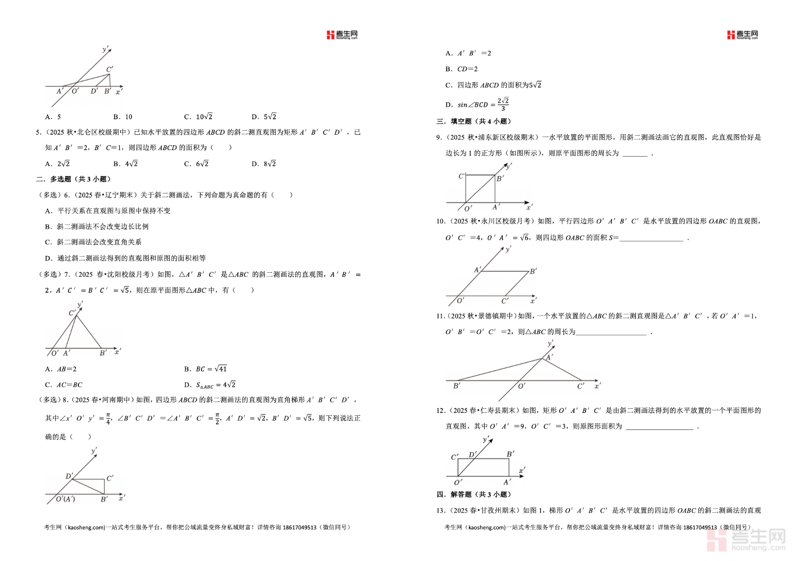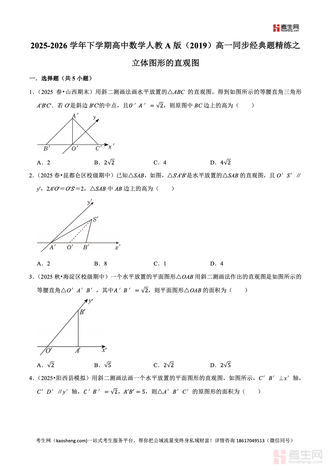 2025-2026 学年下学期高中数学人教 A 版(2019)高一同步经典题精练之立体图形的直观图严格依据人教 A 版 2019 高中数学教材及高一下学期教学进度编写,聚焦立体图形的直观图核心专题,全面覆盖斜二测画法的规则、平面图形与立体图形的直观图绘制、直观图与原图的面积关系、常见几何体直观图识别等高频考点。精选同步基础题、典型例题、易错辨析题、巩固提升题,梯度合理、考点精准,着重强化空间想象、几何直观、作图规范、逻辑推理核心能力,每道题配有详细解析,理清思路、点明易错点与解题技巧。适合高一学生课堂同步练习、课后巩固、单元复习、查漏补缺,夯实立体几何基础,提升数学解题与应试水平。请添加微信 18617049513 进专属群,获取更多免费资源!