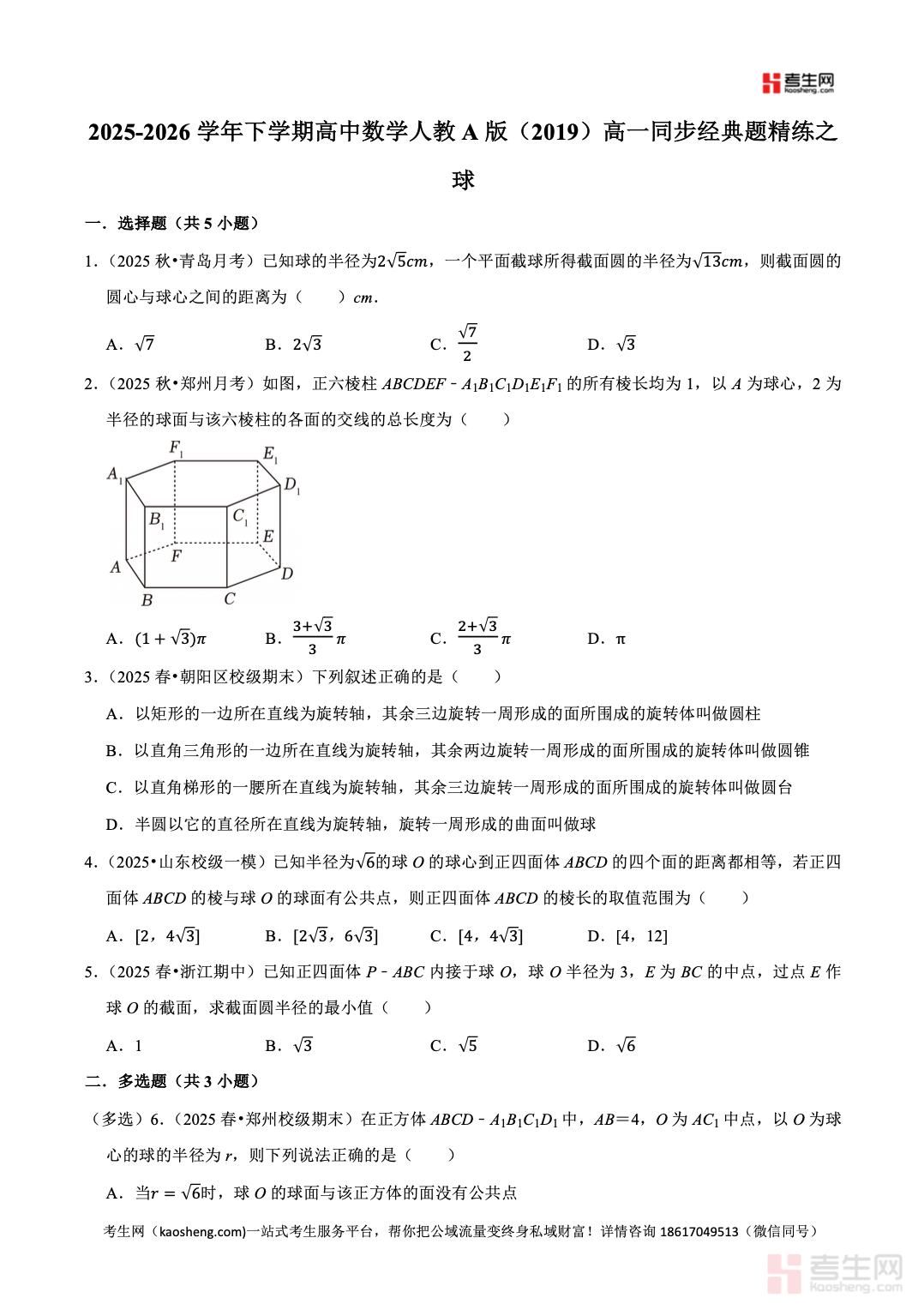 2025-2026 学年下学期高中数学人教 A 版(2019)高一同步经典题精练之球严格依据人教 A 版 2019 高中数学教材及高一下学期教学进度编写,聚焦球核心专题,全面覆盖球的结构特征、表面积公式、体积公式、截面问题、外接球与内切球基础计算等高频考点。精选同步基础题、典型例题、易错辨析题、综合提升题,梯度合理、考点精准,着重强化空间想象、几何直观、运算求解、逻辑推理核心能力,每道题配有详细解析,理清思路、点明易错点与解题技巧。适合高一学生课堂同步练习、课后巩固、单元复习、查漏补缺,夯实立体几何基础,提升数学解题与应试水平。请添加微信 18617049513 进专属群,获取更多免费资源!