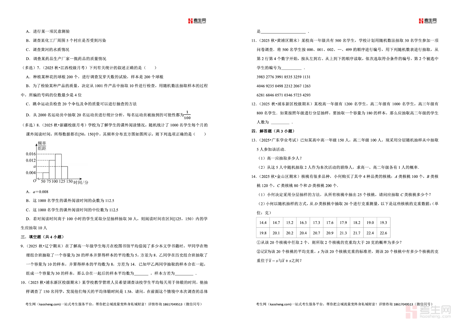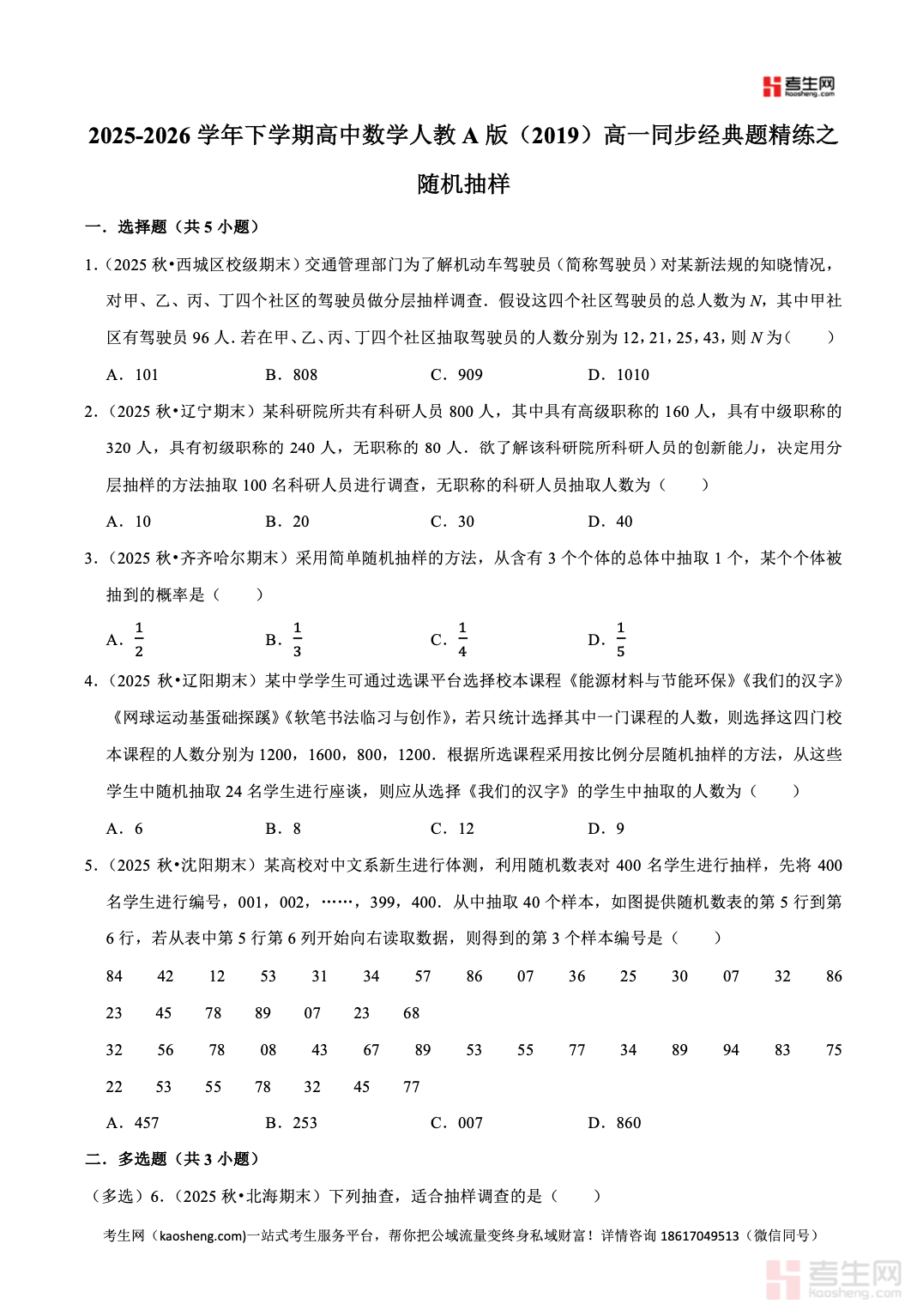2025-2026 学年下学期高中数学人教 A 版(2019)高一同步经典题精练之随机抽样严格依据人教 A 版 2019 高中数学教材及高一下学期教学进度编写,聚焦随机抽样核心专题,全面覆盖简单随机抽样、分层随机抽样、系统抽样、抽样方法的选择与应用、样本与总体的关系等高频考点。精选同步基础题、典型例题、易错辨析题、实际应用题,梯度清晰、考点精准,着重强化数据分析、逻辑推理、数学建模、实践应用核心素养,每道题配有详细解析,理清思路、点明易错点与解题技巧。适合高一学生课堂同步练习、课后巩固、单元复习、期中期末备考,夯实统计基础,提升数学解题与应试水平。请添加微信 18617049513 进专属群,获取更多免费资源!