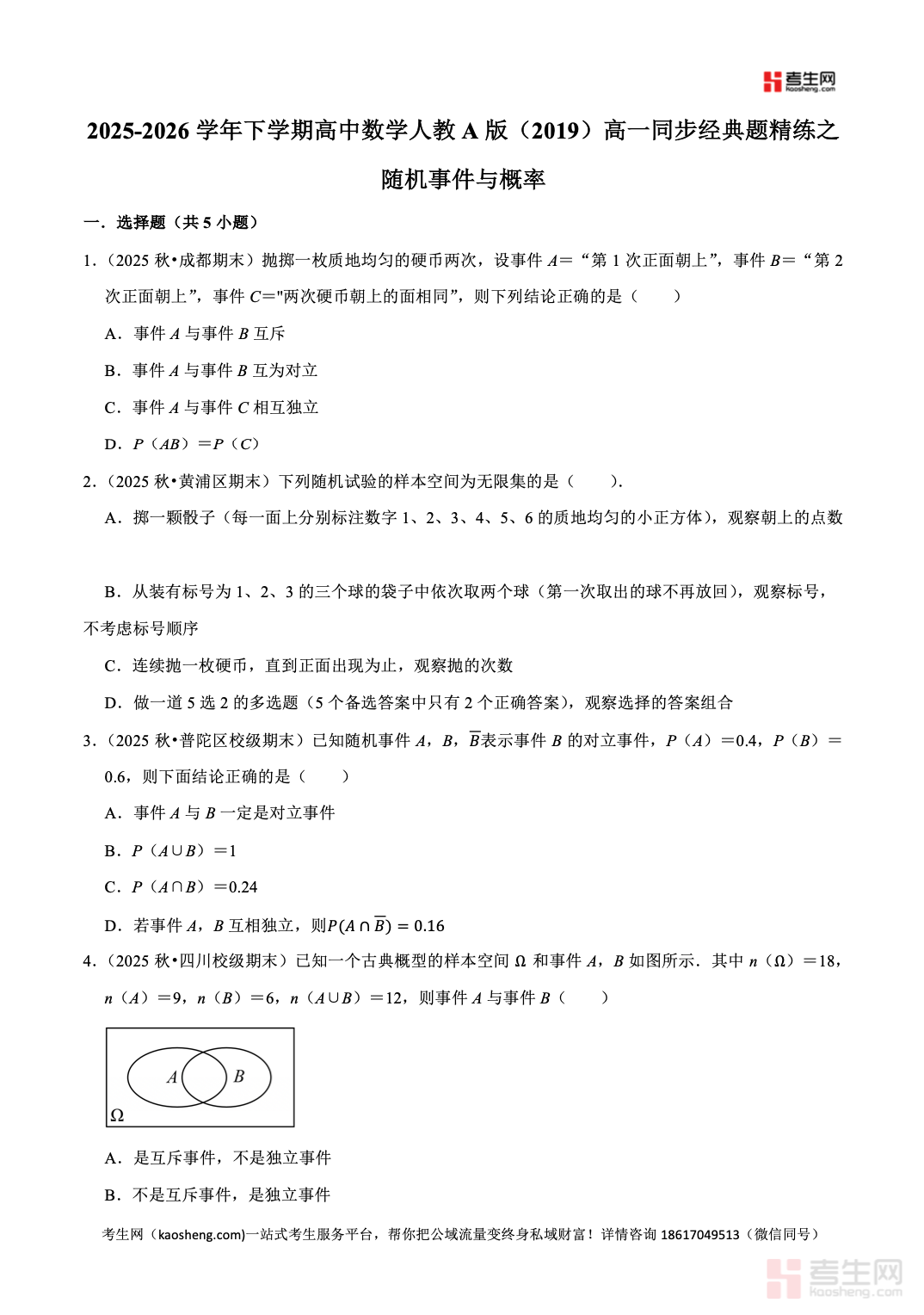 2025-2026 学年下学期高中数学人教 A 版(2019)高一同步经典题精练之随机事件与概率严格依据人教 A 版 2019 高中数学教材及高一下学期教学进度编写,聚焦随机事件与概率核心专题,全面覆盖随机事件、必然事件、不可能事件、事件的关系与运算、概率的意义、古典概型、概率的基本性质等高频考点。精选同步基础题、典型例题、易错辨析题、综合应用题,梯度合理、考点精准,着重强化逻辑推理、数据分析、运算求解、数学建模核心能力,每道题配有详细解析,理清思路、点明易错点与解题技巧。适合高一学生课堂同步练习、课后巩固、单元复习、期中期末备考,夯实概率知识基础,提升数学解题与应试水平。请添加微信 18617049513 进专属群,获取更多免费资源!