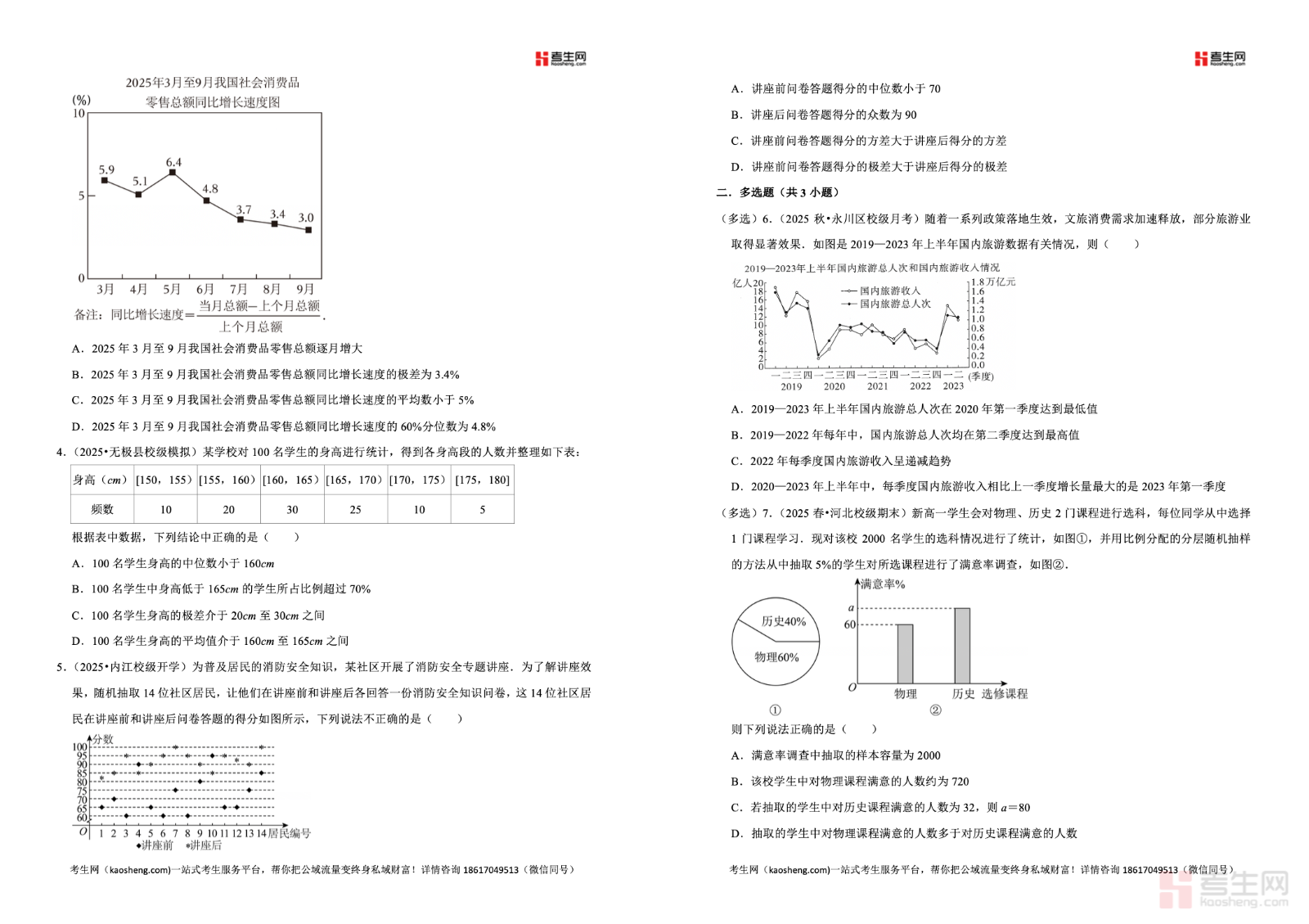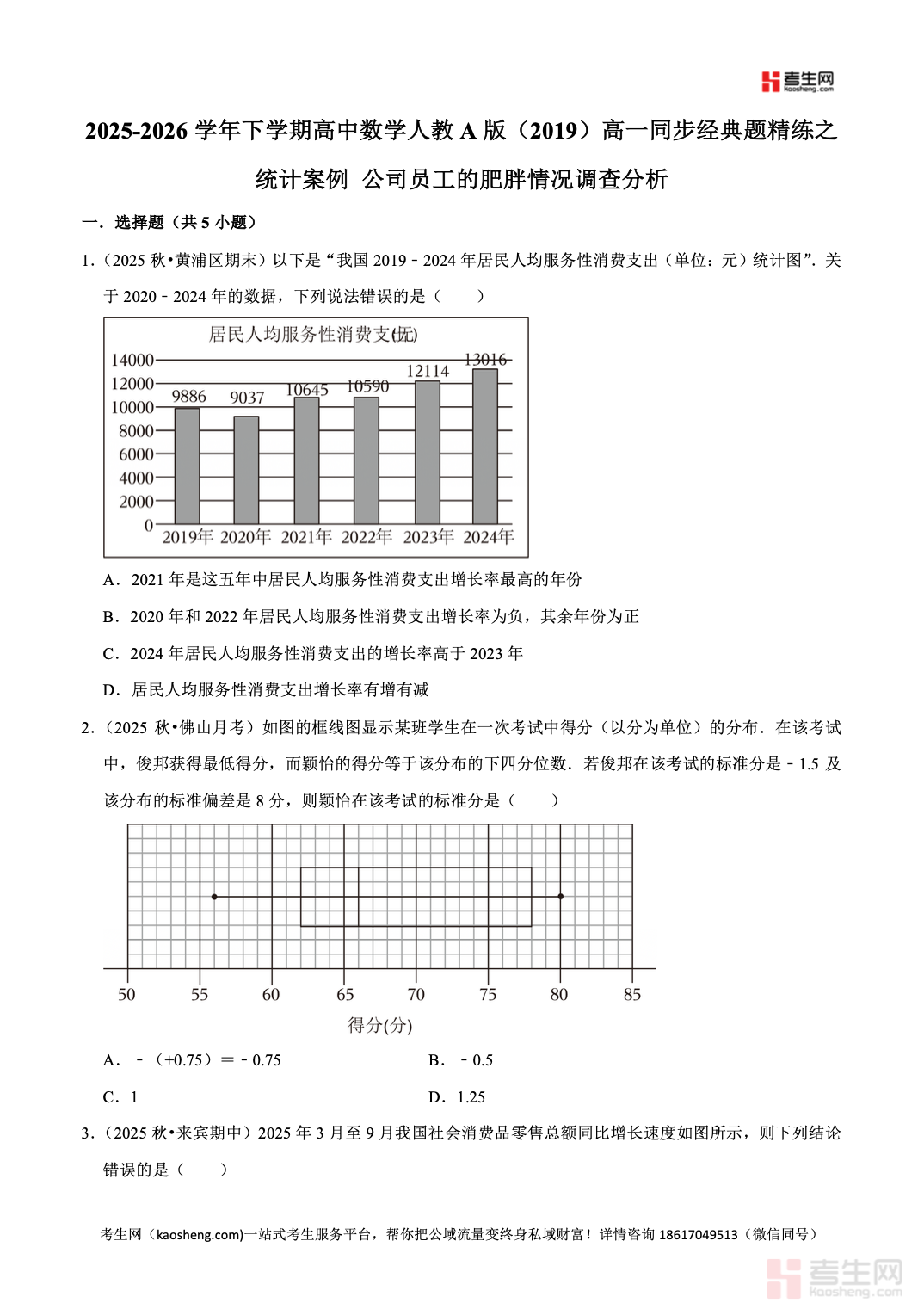 2025-2026 学年下学期高中数学人教 A 版(2019)高一同步经典题精练之统计案例 公司员工的肥胖情况调查分析严格依据人教 A 版 2019 高中数学教材及高一下学期教学进度编写,聚焦统计案例 公司员工的肥胖情况调查分析核心专题,全面覆盖抽样调查设计、数据收集与整理、数据描述(频率分布、平均数、方差)、肥胖标准判定、调查结论分析与应用等高频考点。精选同步基础题、典型例题、实践应用题、综合分析题,梯度合理、贴合教材案例,着重强化数据分析、数学建模、实践应用、逻辑推理核心素养,每道题配有详细解析,理清调查思路、点明数据处理技巧与易错点。适合高一学生课堂同步练习、课后巩固、统计案例专项复习、查漏补缺,夯实统计实践基础,提升数据处理与综合分析能力。请添加微信 18617049513 进专属群,获取更多免费资源!