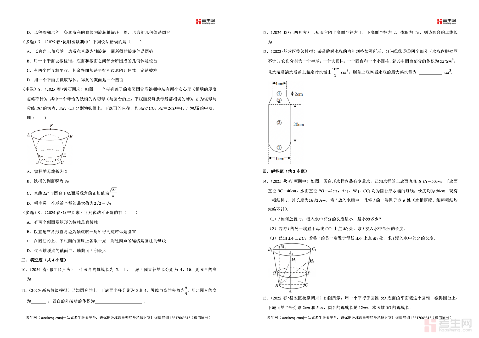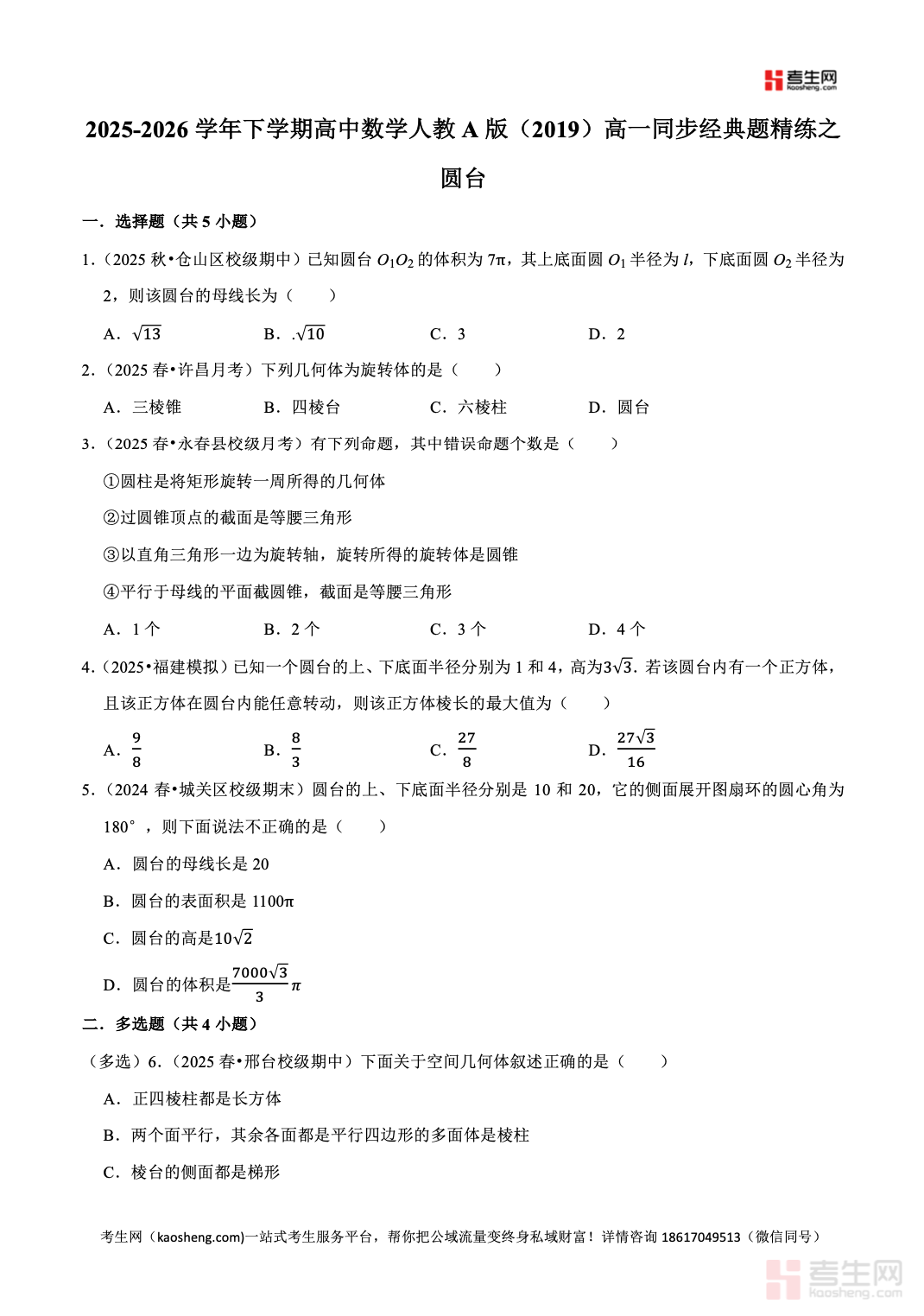 2025-2026 学年下学期高中数学人教 A 版(2019)高一同步经典题精练之圆台严格依据人教 A 版 2019 高中数学教材及高一下学期教学进度编写,聚焦圆台核心专题,全面覆盖圆台的定义与结构特征、圆台的表面积公式、圆台的体积计算、圆台与圆锥圆柱的关系、轴截面与截面问题等高频考点。精选同步基础题、典型例题、易错辨析题、综合应用题,梯度合理、考点精准,着重强化空间想象、几何直观、运算求解、逻辑推理核心能力,每道题配有详细解析,理清思路、点明易错点与解题技巧。适合高一学生课堂同步练习、课后巩固、单元复习、查漏补缺,夯实立体几何基础,提升数学解题与应试水平。请添加微信 18617049513 进专属群,获取更多免费资源!
