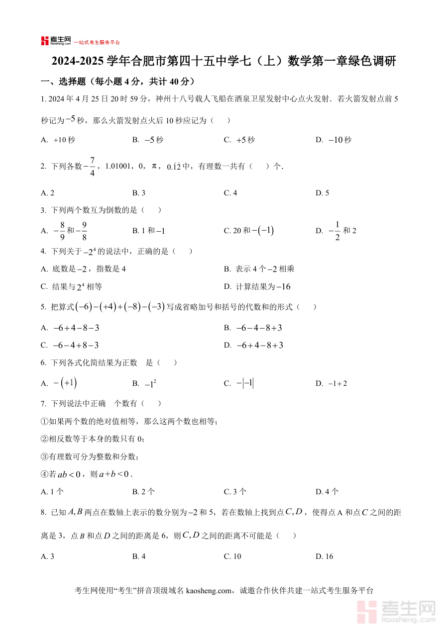 《精品解析:安徽省合肥市第四十五中学2024-2025学年七年级上学期第一次月考数学试卷(原卷版)》是针对安徽省合肥市第四十五中学2024-2025学年七年级上学期数学学科第一次月考的原卷版备考资料,包含该阶段考试的原始试卷内容,能够为相关使用者提供贴近实际考试场景的参考,助力把握本次月考的基本结构与考查方向,为后续的学习与备考奠定基础。