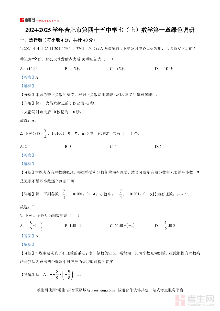 《精品解析:安徽省合肥市第四十五中学2024-2025学年七年级上学期第一次月考数学试卷(解析版)》是针对安徽省合肥市第四十五中学在2024-2025学年七年级上学期开展的第一次数学月考所编制的解析类备考资料。该资料紧密围绕本次月考的试卷内容进行系统解析,为使用者提供与考试直接关联的参考内容,有助于快速把握本次月考的核心考查方向与基本要求。