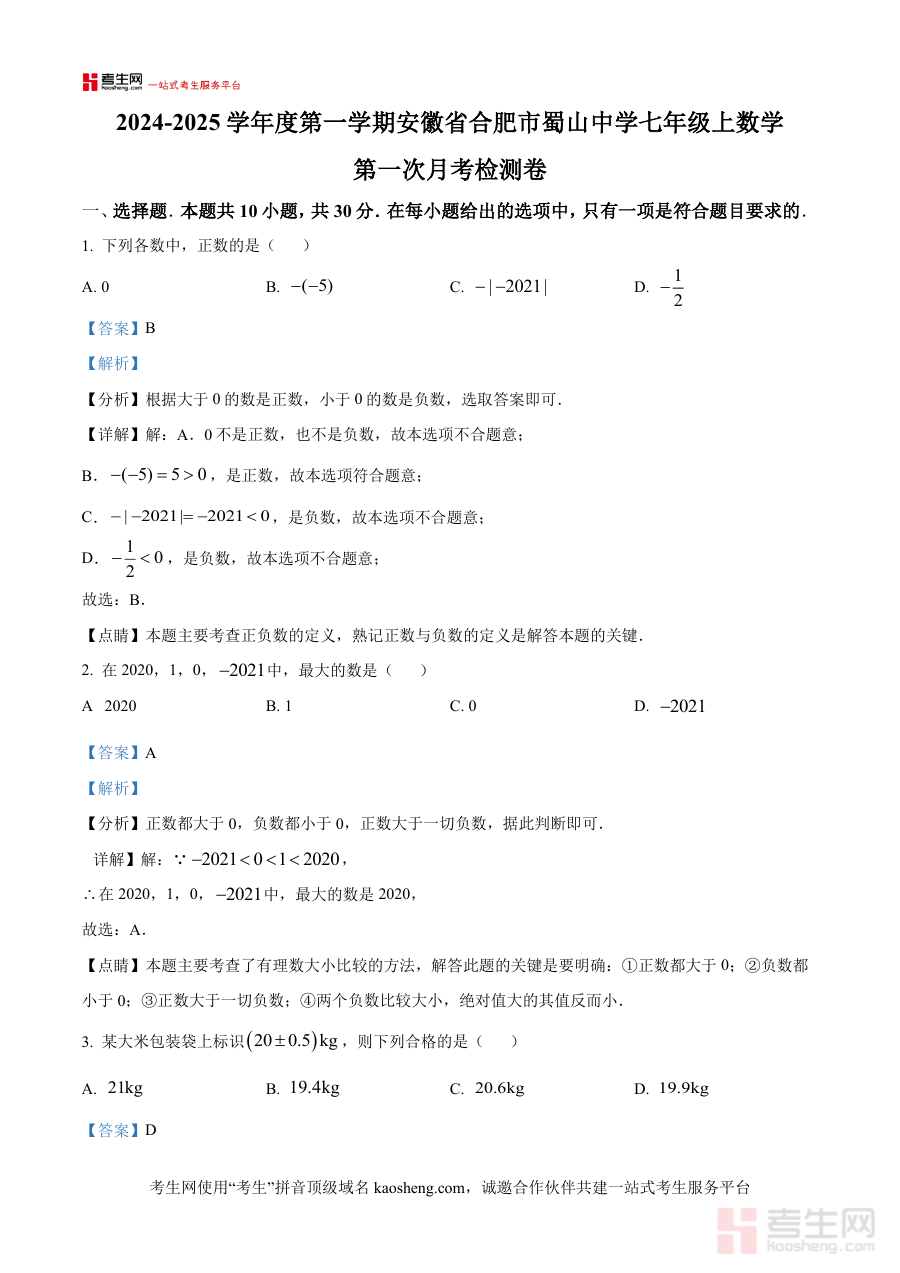 《精品解析:安徽省合肥市蜀山区中学2024—2025学年上学期第一次月考七年级数学检测卷(解析版)》是针对安徽省合肥市蜀山区中学2024至2025学年第一学期七年级数学第一次月考的专项备考资料,其核心定位是为该区域七年级学生提供与本地学情和考试要求相匹配的阶段性复习参考,帮助学生提前熟悉月考的考查方向和区域命题特点,确保复习内容与本地教学进度及考试标准保持一致。