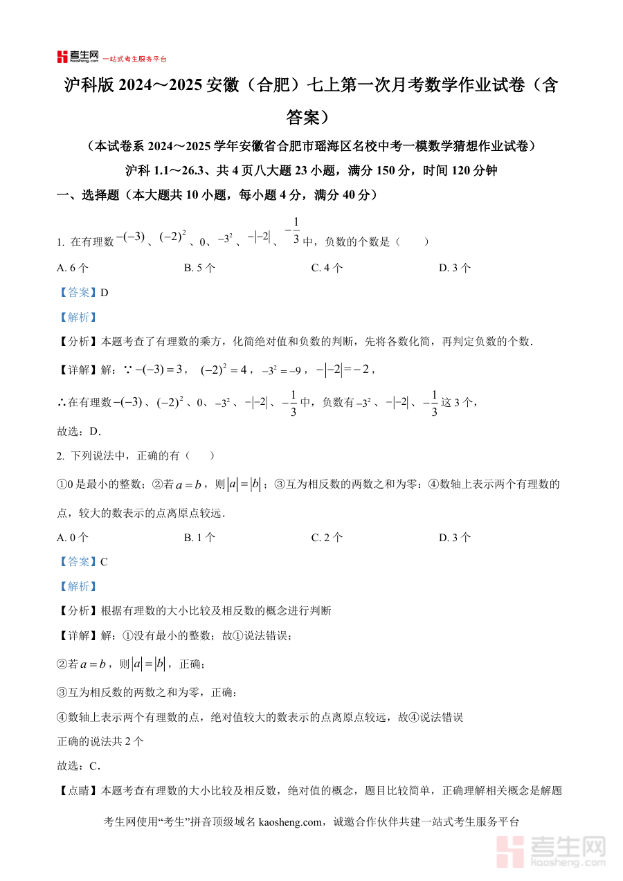 《精品解析:沪科版 2024-2025学年七年级数学上册第一次月考数学(猜想)作业试卷(解析版)》是面向2024至2025学年采用沪科版数学教材的七年级学生打造的第一次月考专属备考资料。该资料紧密围绕七年级上册数学学科的前期学习模块,以月考这一阶段性评价场景为导向,通过猜想式试卷形式模拟真实考试情境,并配备全面详细的解析内容,为学生提供兼具练习与参考价值的备考载体。