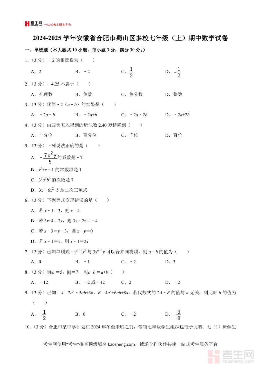 《安徽省合肥市蜀山区多校2024-2025学年七年级上学期期中数学试卷》是安徽省合肥市蜀山区多所学校联合编制的期中阶段数学考试资料,对应2024至2025学年七年级上学期的期中检测场景,贴合该区域七年级数学教学进度与本地命题特色,为学生提供符合区域考试要求的备考资源,帮助学生提前适应期中数学考试的命题风格与考查范围。