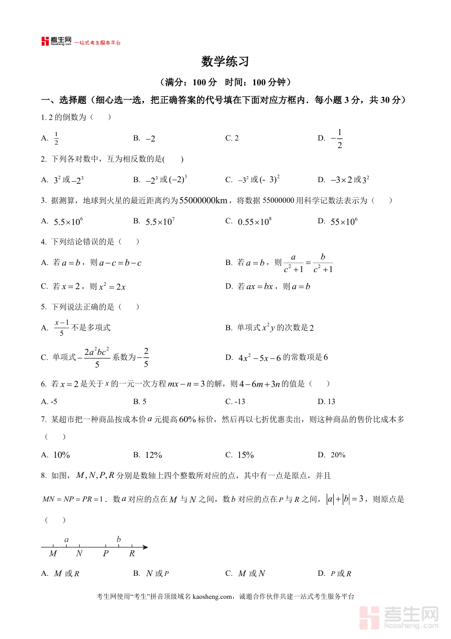 该资料可用于七年级学生进行期中数学学习情况的阶段性诊断,帮助教师掌握学生在期中阶段的知识掌握状况,也为家长了解孩子学习进度提供参考。通过原卷版的呈现形式,使用者能直观感知考试结构与考查方向,辅助优化学习策略或教学安排。