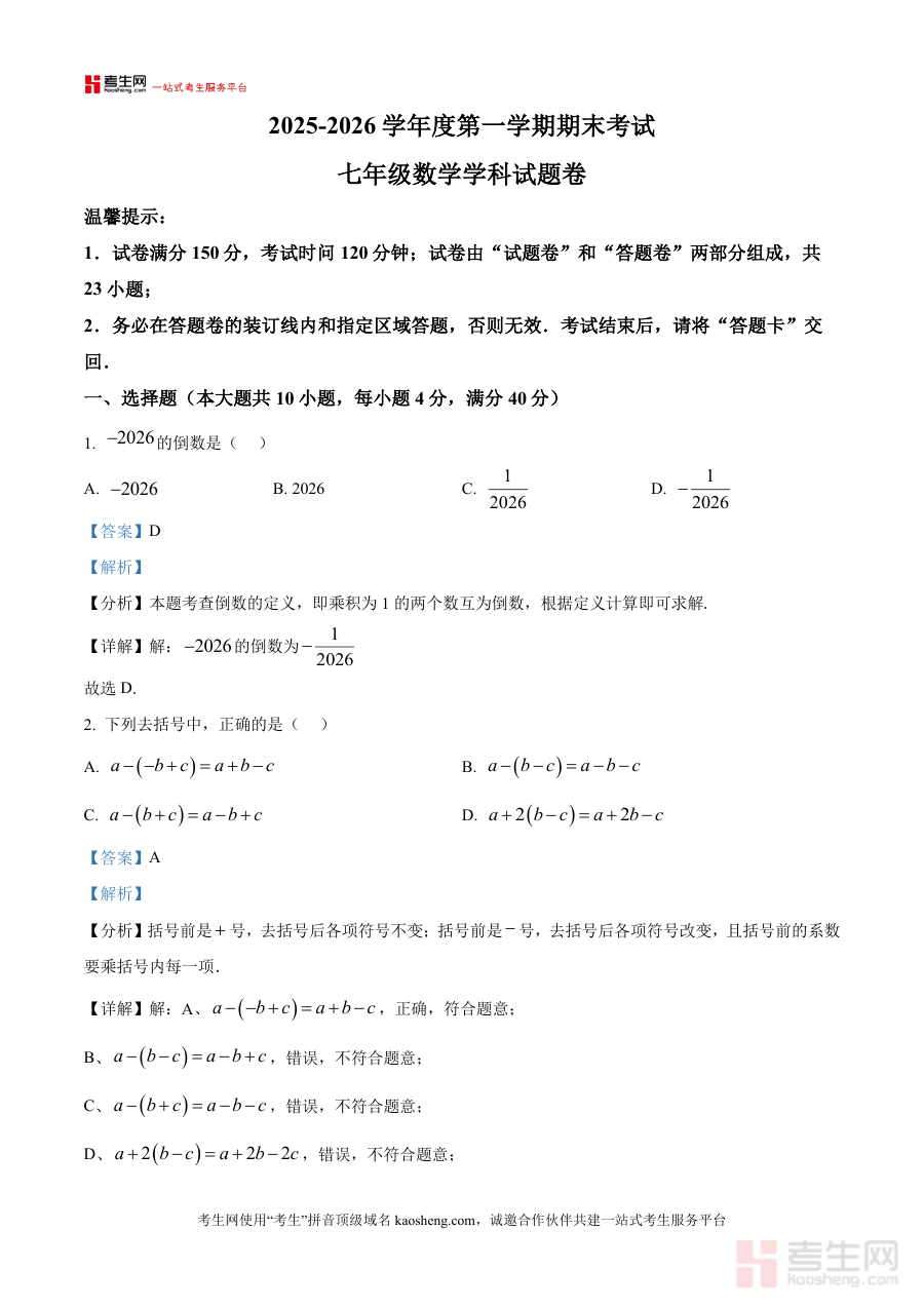 《精品解析:安徽合肥市行知学校2025-2026学年度第一学期期末考试七年级数学试卷(解析版)》是针对安徽合肥市行知学校特定学年学期期末考试的数学学科备考资料。该资料聚焦2025-2026学年度第一学期的期末检测场景,结合学校自身的教学进度与考试要求,以解析版形式呈现试卷内容,能够帮助使用者快速把握该次期末考试的核心方向、考查重点及评分标准等关键信息,为后续备考提供清晰指引。
