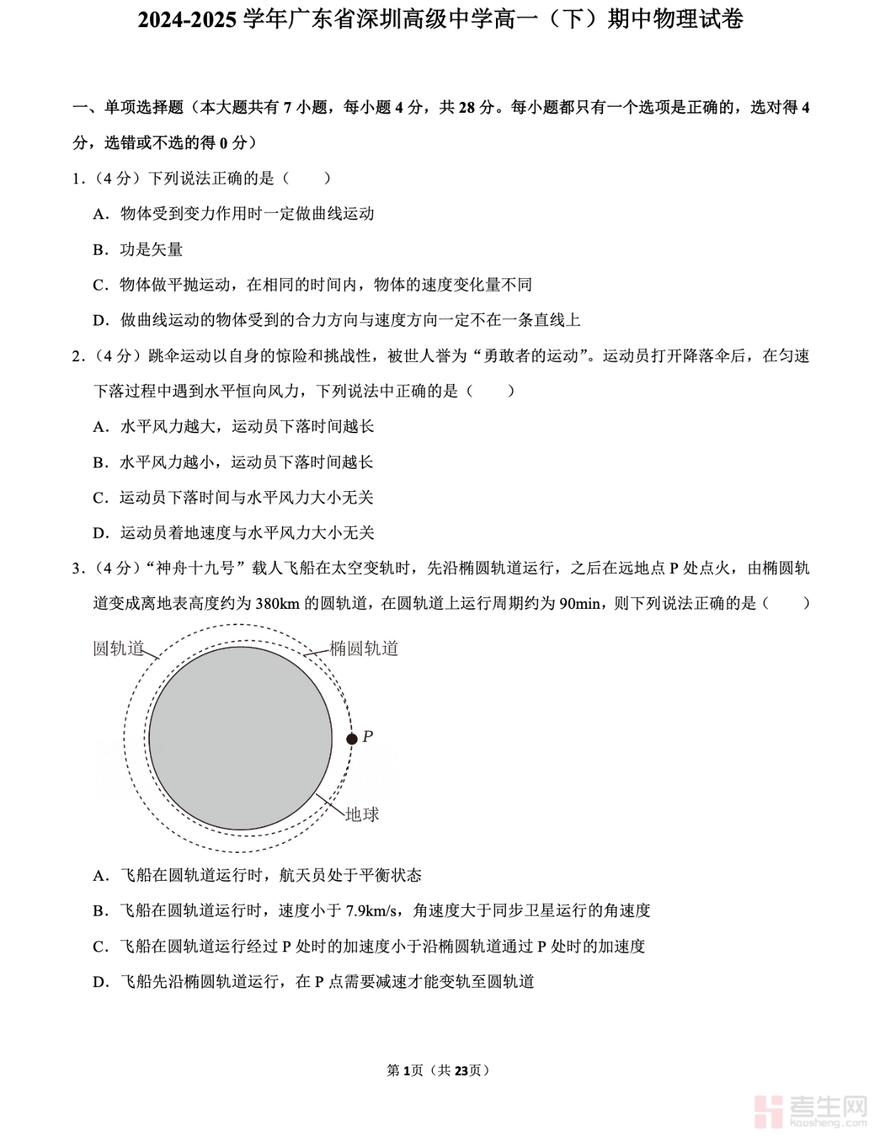 2024-2025 学年广东省深圳高级中学高一(下)期中物理试卷,贴合深圳高级中学高一学情与教学进度,严格遵循高中物理教材及期中考查要求命制,精准复刻该校期中命题风格与难度梯度。试卷聚焦曲线运动、圆周运动、平抛运动、万有引力定律等核心考点,全面覆盖运动的合成与分解、向心力、天体运动基础等高频知识点,题型包含选择题、实验题、计算题,贴合期中考查重点,着重考查空间想象、逻辑推理、运算求解、实验探究核心素养。试卷完整呈现真题命题规律,配套详细解析,理清解题思路、点明易错点与解题技巧,适合深圳高级中学及省内同类学校高一学生期中备考、学情检测、查漏补缺,精准把握期中命题方向,提升应试能力。请添加微信 18617049513 进专属群,获取更多免费资源!