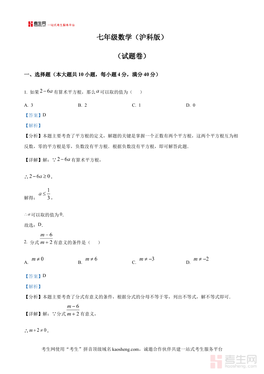 《精品解析:合肥市新站区七下数学月考卷沪科版(解析版)》是面向合肥市新站区七年级下学期学生打造的数学月考试卷配套解析资料,严格遵循沪科版数学教材的知识体系与区域教学进度要求编制。该资料聚焦本地七年级数学阶段性考试的特点,通过对月考试卷的全面解析,为使用者提供贴合区域命题方向与考查重点的学习支持,是区域内七年级学生进行数学阶段备考与自我检测的重要资源之一,能够帮助使用者快速对接本地考试的实际需求,为阶段学习提供精准指引。