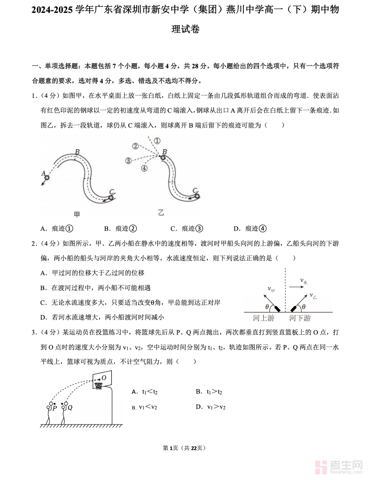 2024-2025学年广东省深圳市新安中学(集团)燕川中学高一(下)期中物理试卷