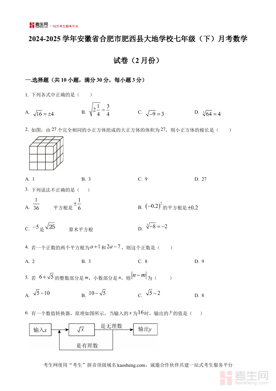 《精品解析:安徽省合肥市肥西县大地学校2024-2025学年七年级下学期月考数学试卷(2月份)(原卷版)》是针对安徽省合肥市肥西县大地学校特定学年学期的数学月度检测资料,对应七年级下学期2月份的月考场景,为使用者提供了贴合该校教学进度与考试要求的原卷内容。作为衔接七年级上学期知识巩固与下学期新阶段学习的重要参考载体,该资料能够帮助使用者直观把握本次月考的试卷框架与考查方向,是符合该校教学实际的针对性备考资源。