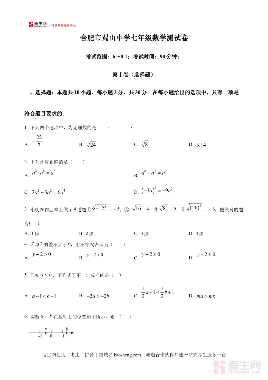 《精品解析:安徽省合肥市蜀山中学2024-2025学年七年级下学期3月月考数学试题(原卷版)》是针对安徽省合肥市蜀山中学在2024-2025学年七年级下学期3月组织的数学月考所编制的专业备考资料,精准匹配该学校该年级该阶段的数学学习进度与月考考查需求,为师生提供贴合实际教学场景的高质量参考素材,助力师生更好地应对本次月考。