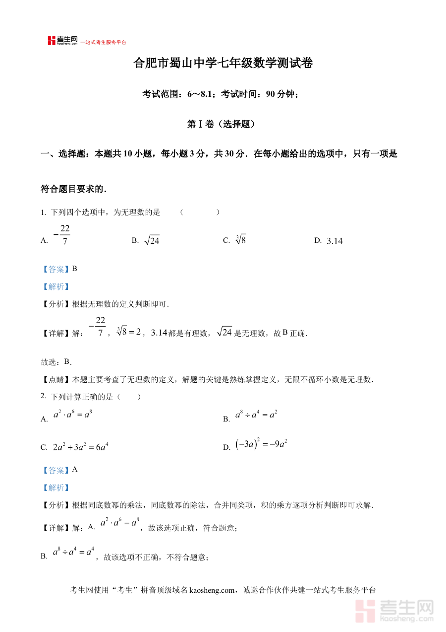 《精品解析:安徽省合肥市蜀山中学2024-2025学年七年级下学期3月月考数学试题(解析版)》是针对安徽省合肥市蜀山中学2024-2025学年七年级下学期3月数学月考开发的专业备考资料。该资料紧密结合蜀山中学七年级下学期3月的教学进度与月考命题特点,为使用者提供了与本次考试直接相关的试题及配套解析内容,是把握该次月考考查方向与学习重点的重要参考载体,能够帮助使用者快速对接考试要求并明确学习目标。