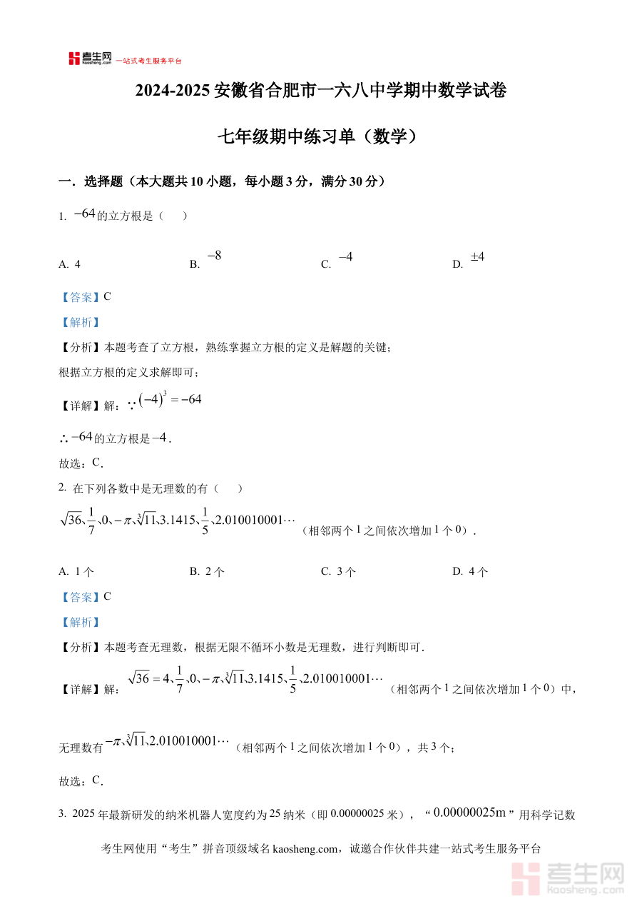 《精品解析:安徽省合肥市一六八中学2024-2025学年下学期七年级期中数学试卷(解析版)》是面向安徽省合肥市一六八中学特定学段学生的期中数学考试配套备考资料,精准对应2024至2025学年下学期七年级的中期学习评估需求,紧密贴合该校期中数学测试的命题框架与考查方向,为使用者提供兼具针对性与实用性的学习辅助资源,助力学生更好地应对学校组织的期中数学检测。