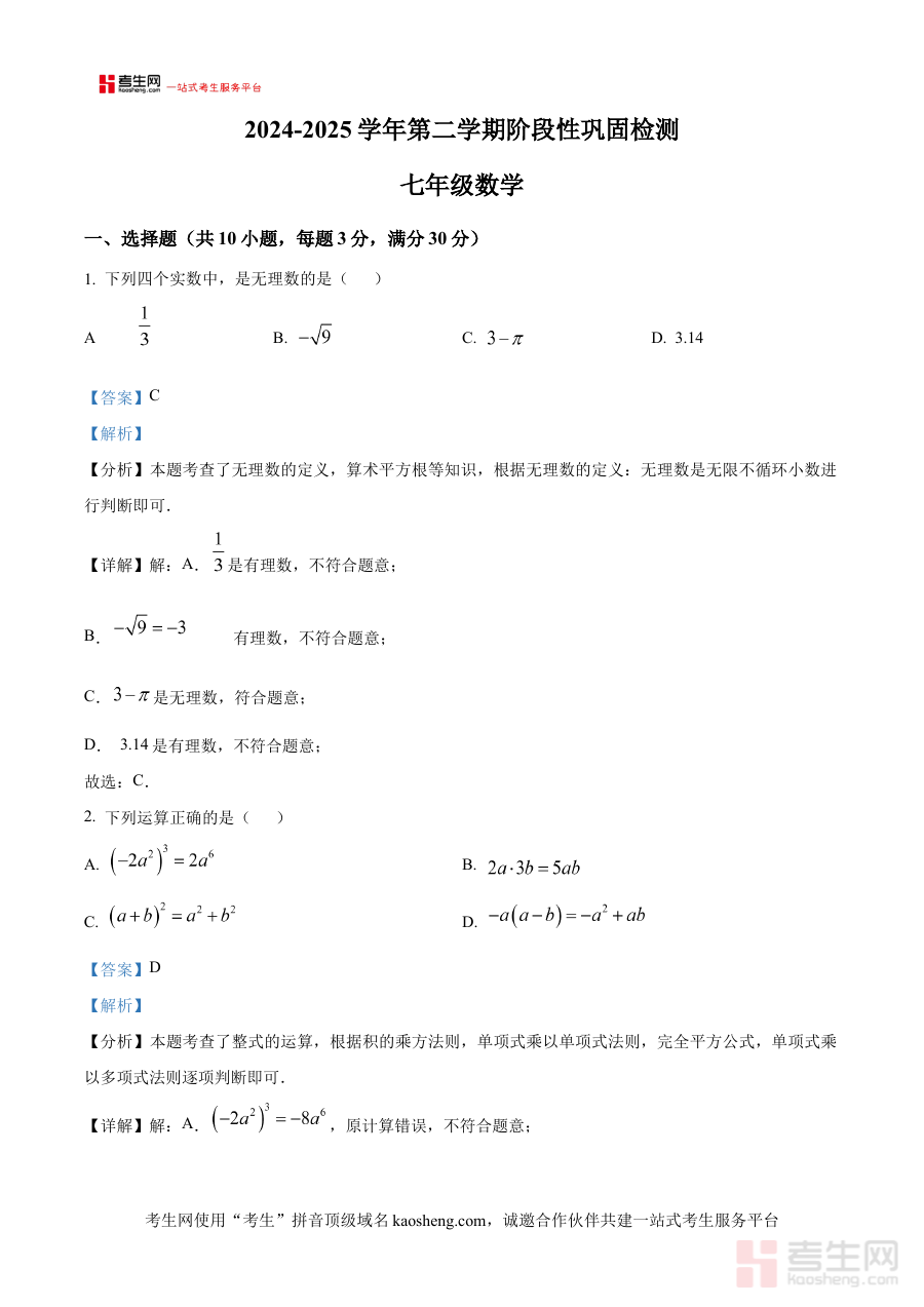 《精品解析:安徽省合肥市包河区2024-2025学年七年级下学期4月期中数学试题(解析版)》是针对安徽省合肥市包河区特定学年与考试节点的数学学科备考资料,精准覆盖2024-2025学年七年级下学期4月份的期中检测场景,紧密贴合该地区初中数学教学的阶段性评价需求,为相关使用者提供与本地考试体系高度匹配的参考内容,助力使用者更好地应对期中阶段的数学学科检测。