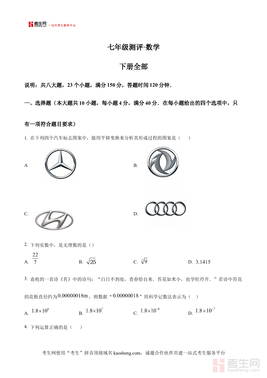 《精品解析:安徽省合肥市2024--2025学年七年级下学期期末测评数学试卷(原卷版)》是面向安徽省合肥市2024至2025学年七年级下学期学生推出的数学期末测评配套备考资料,精准对接当地该学年七年级下学期数学学科的期末检测要求,严格遵循本地教学大纲与测评标准编制而成,呈现与实际期末测评完全一致的试卷结构、题量设置及作答规范,帮助使用者提前熟悉考试场景与流程,为高效备考提供可靠支撑。
