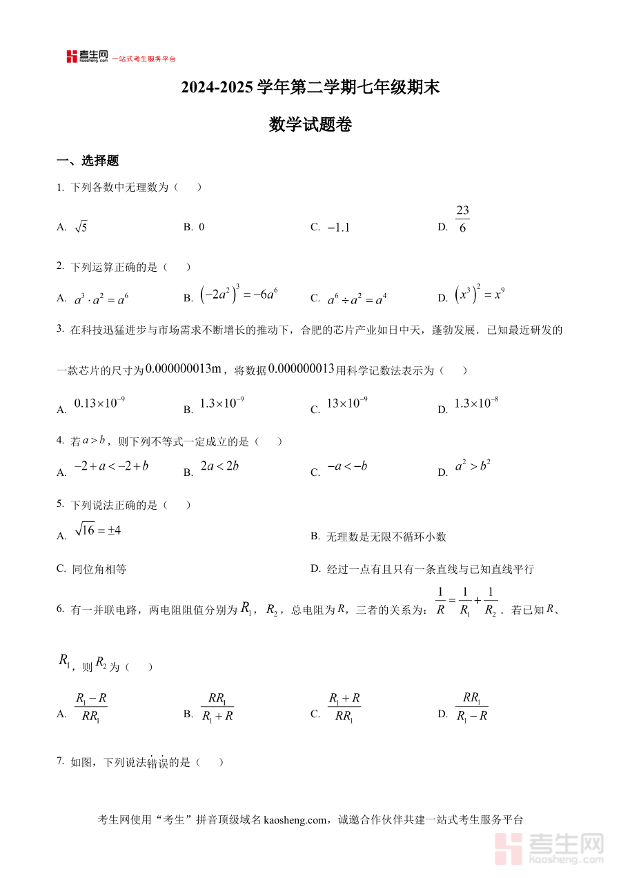 《精品解析:安徽省合肥市2024-2025学年下学期七年级数学期末试题卷(原卷版)》是面向安徽省合肥市区域内2024至2025学年第二学期七年级学生设计的数学学科期末检测原卷资料,精准对应该学年该学段数学学科的期末考核体系与本地命题特色,为相关使用者提供了直接贴合合肥市七年级数学期末考要求的备考支撑。作为期末复习阶段的关键资料之一,它能够帮助使用者清晰把握本地期末考的试卷结构、题型分布方向与考核重点范围,为后续系统化复习规划奠定坚实基础。