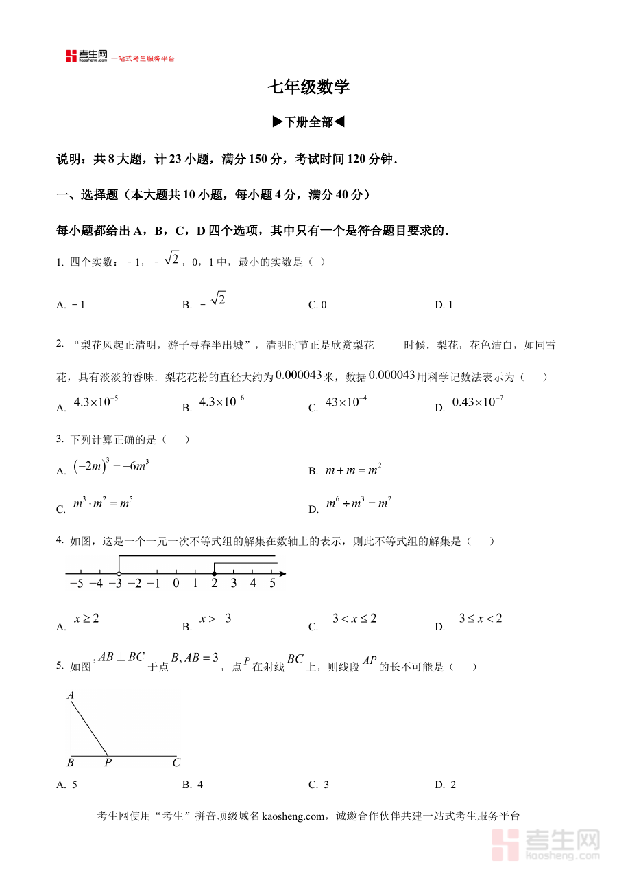 《精品解析:安徽省合肥市包河区2024--2025学年七年级下学期期末数学试卷(原卷版)》是针对安徽省合肥市包河区2024至2025学年七年级下学期期末数学考试打造的专业备考资料。该资料紧密围绕包河区初中数学教学大纲与期末评价标准,精准匹配七年级下学期数学教学进度与本地期末考试的命题方向,为使用者提供与本地实际考试场景高度一致的练习素材,帮助使用者提前熟悉考试的整体结构、题型分布逻辑及本地命题特色。
